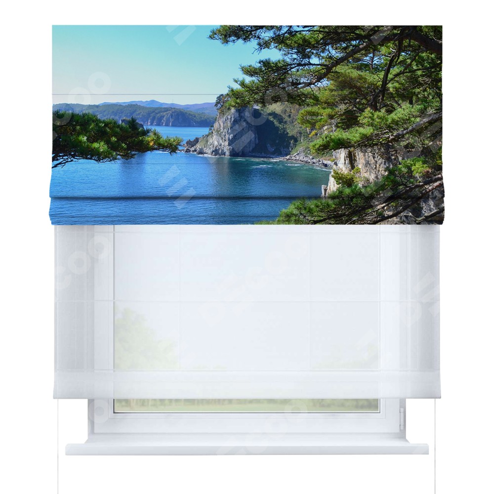 Римская штора день-ночь производителя «Cortin», используется для проёма, пошита из двух полотен, с лицевой блэкаут с нанесением сублимационной печати «Море и сосны», вторая ткань тюль (по стандарту комплектуется тюль белого цвета артикул V-01). Имеет универсальный механизм и подходит для монтажа: на потолок, на стену и в нишу.