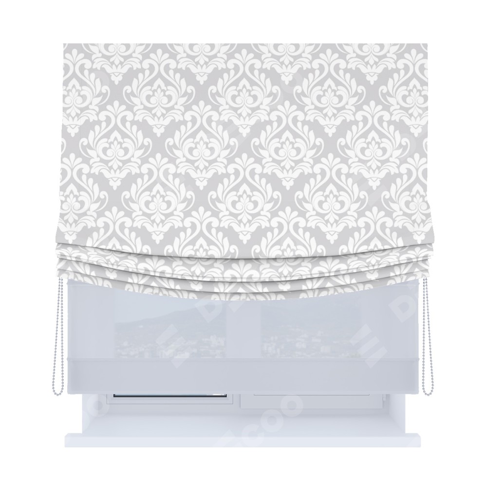 Римская штора день-ночь производителя «Cortin», используется для проёма, пошита из двух полотен, с лицевой блэкаут с нанесением сублимационной печати «Дамаск светлый», вторая ткань тюль (по стандарту комплектуется тюль белого цвета артикул V-01). Имеет универсальный механизм и подходит для монтажа: на потолок, на стену и в нишу. Удобное управление каждой шторой отдельно.