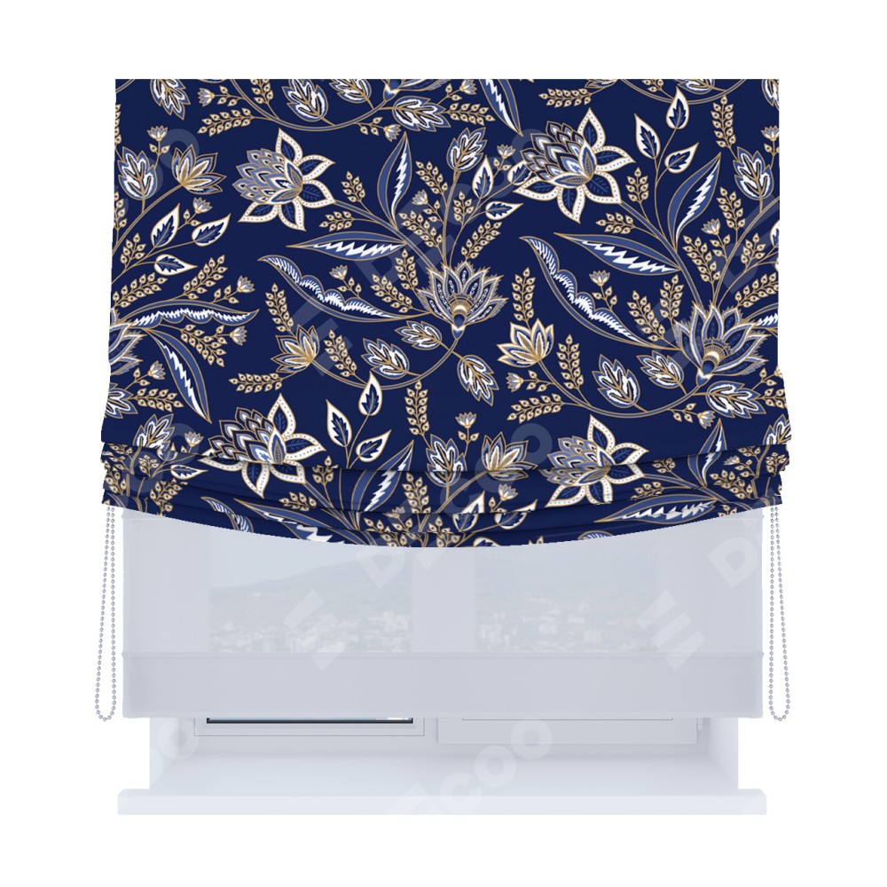 Римская штора день-ночь производителя «Cortin», используется для проёма, пошита из двух полотен, с лицевой блэкаут с нанесением сублимационной печати «Индиго батик», вторая ткань тюль (по стандарту комплектуется тюль белого цвета артикул V-01). Имеет универсальный механизм и подходит для монтажа: на потолок, на стену и в нишу. Удобное управление каждой шторой отдельно.