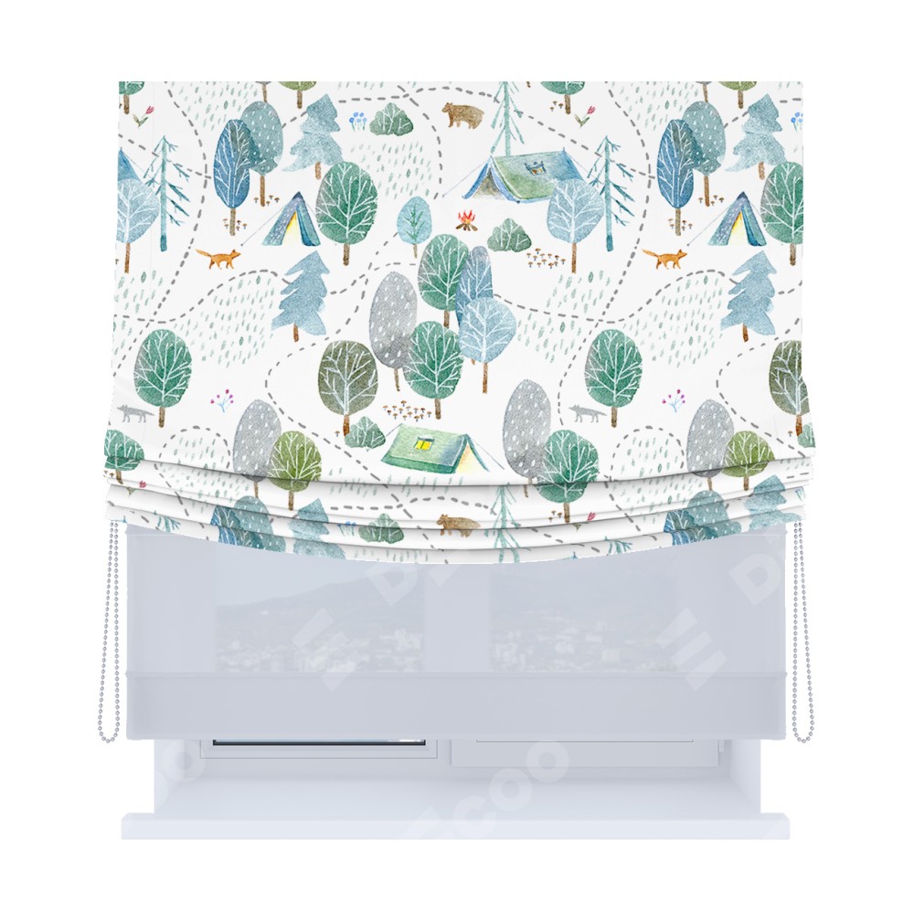 Римская штора день-ночь производителя «Cortin», используется для проёма, пошита из двух полотен, с лицевой блэкаут с нанесением сублимационной печати «Лесистая местность», вторая ткань тюль (по стандарту комплектуется тюль белого цвета артикул V-01). Имеет универсальный механизм и подходит для монтажа: на потолок, на стену и в нишу. Удобное управление каждой шторой отдельно.