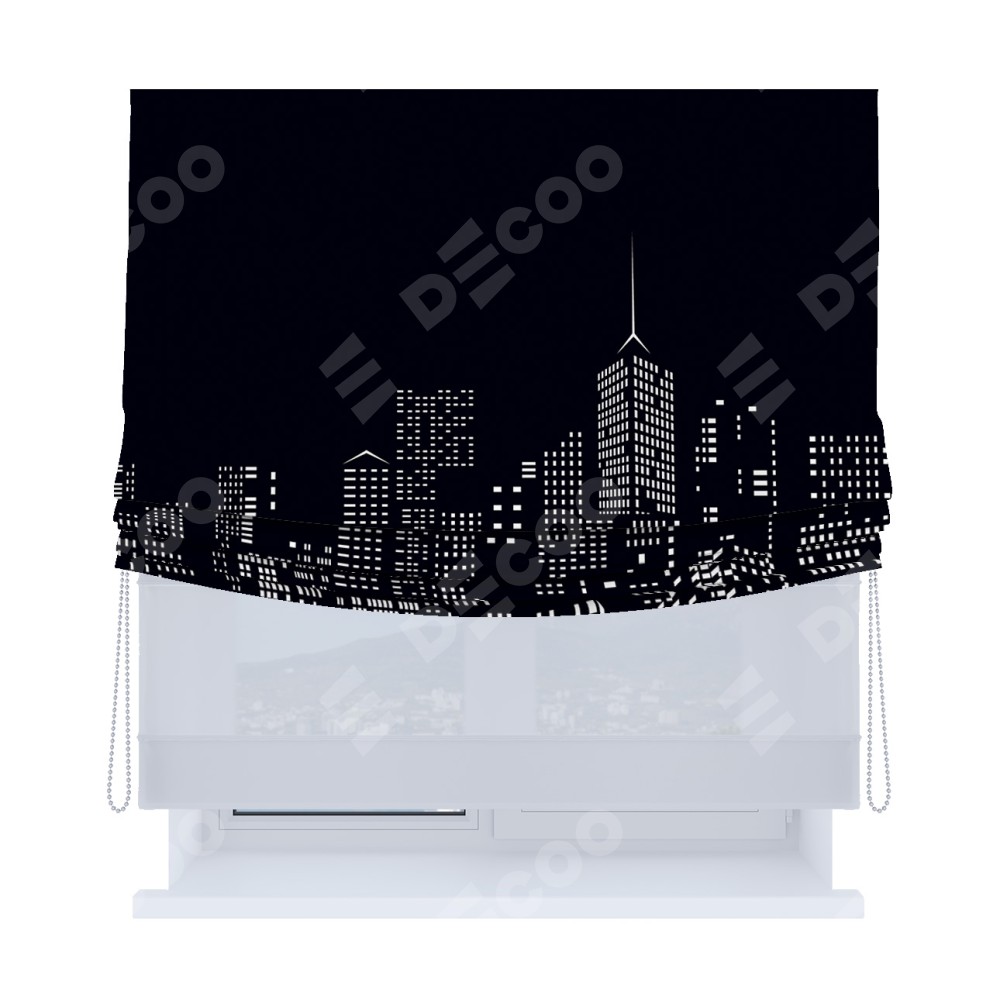 Римская штора день-ночь производителя «Cortin», используется для проёма, пошита из двух полотен, с лицевой блэкаут с нанесением сублимационной печати «Ночной город», вторая ткань тюль (по стандарту комплектуется тюль белого цвета артикул V-01). Имеет универсальный механизм и подходит для монтажа: на потолок, на стену и в нишу. Удобное управление каждой шторой отдельно.