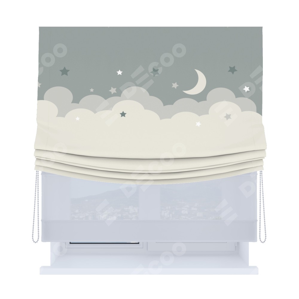 Римская штора день-ночь производителя «Cortin», используется для проёма, пошита из двух полотен, с лицевой блэкаут с нанесением сублимационной печати «Ночные облака», вторая ткань тюль (по стандарту комплектуется тюль белого цвета артикул V-01). Имеет универсальный механизм и подходит для монтажа: на потолок, на стену и в нишу. Удобное управление каждой шторой отдельно.