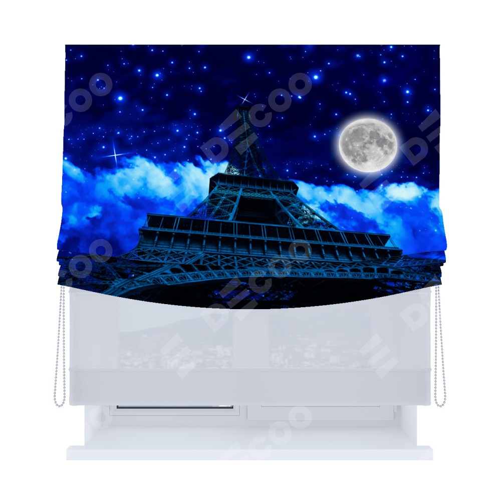 Римская штора день-ночь производителя «Cortin», используется для проёма, пошита из двух полотен, с лицевой блэкаут с нанесением сублимационной печати «Ночь в Париже», вторая ткань тюль (по стандарту комплектуется тюль белого цвета артикул V-01). Имеет универсальный механизм и подходит для монтажа: на потолок, на стену и в нишу. Удобное управление каждой шторой отдельно.