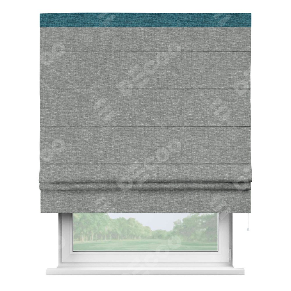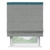 Римская штора производителя «Cortin», используется для проёма, пошита из ткани рогожка димаут тёмно-серый, артикул 80418. Отделка шторы кантом «Кинг», ткань для канта используется из рогожки димаут разной расцветки на выбор. Имеет универсальный механизм и подходит для монтажа: на потолок, на стену и в нишу.