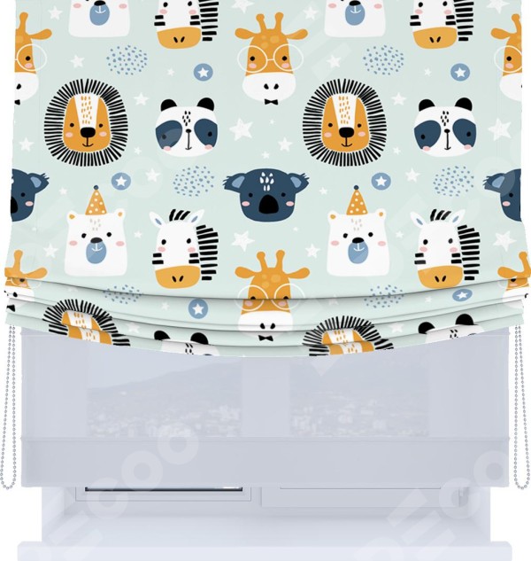 Римская штора день-ночь производителя «Cortin», используется для проёма, пошита из двух полотен, с лицевой блэкаут с нанесением сублимационной печати «Чудесный зоопарк», вторая ткань тюль (по стандарту комплектуется тюль белого цвета артикул V-01). Имеет универсальный механизм и подходит для монтажа: на потолок, на стену и в нишу. Удобное управление каждой шторой отдельно.