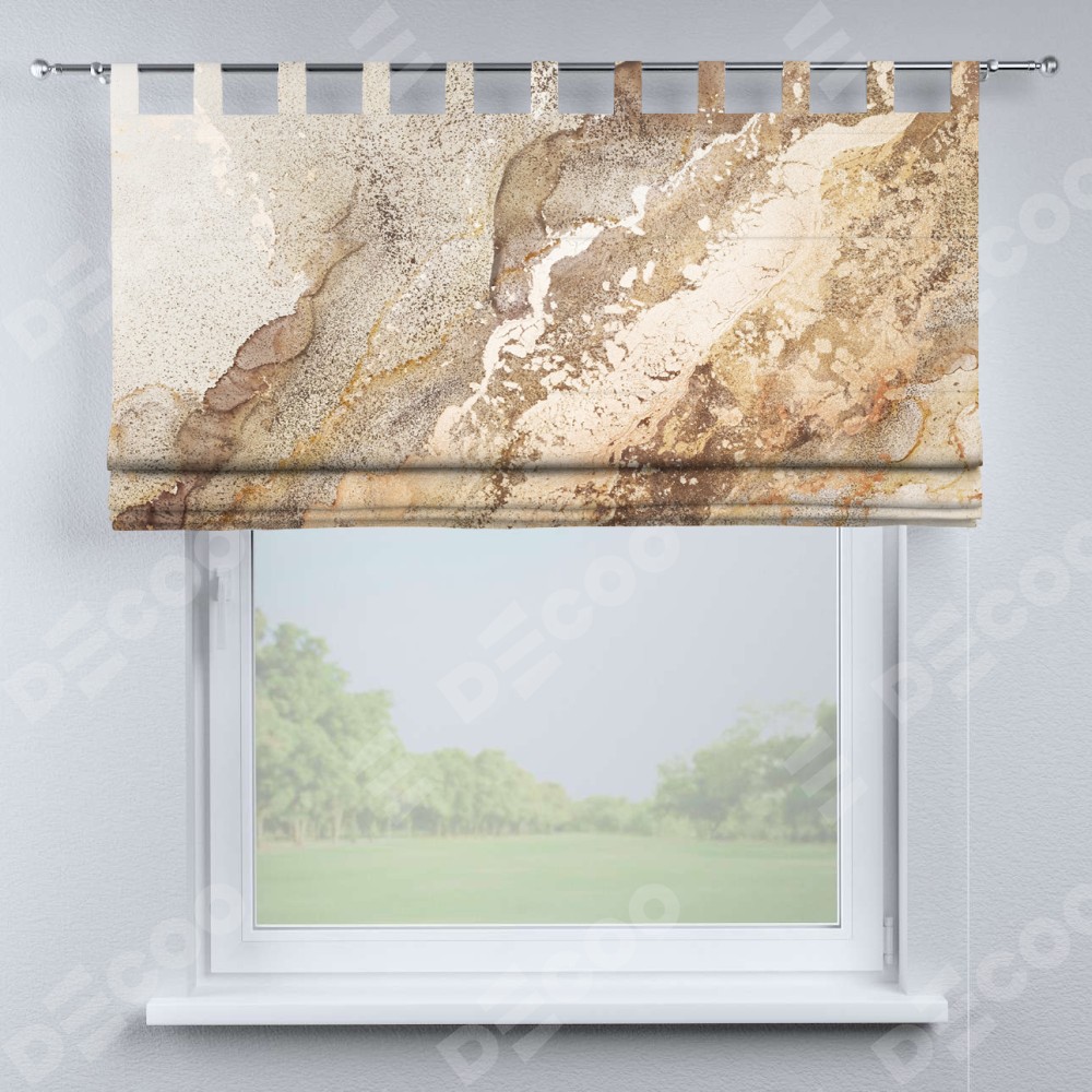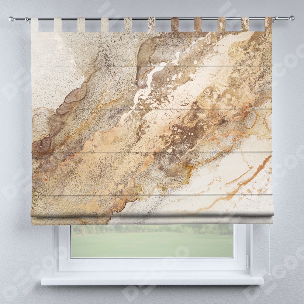 Римская штора производителя «Cortin», используется для проёма, пошита из ткани блэкаут с нанесением сублимационной печати «Бежево-золотой мрамор». Данная модель пошита на петлях, комплектуется на выбор круглым карнизом и подходит для монтажа на стену. Римская штора на петлях имеет простую систему регулировки высоты, отличительным преимуществом данной модели является простой способ монтажа. Достаточно повесить ее на трубу и штора готова!