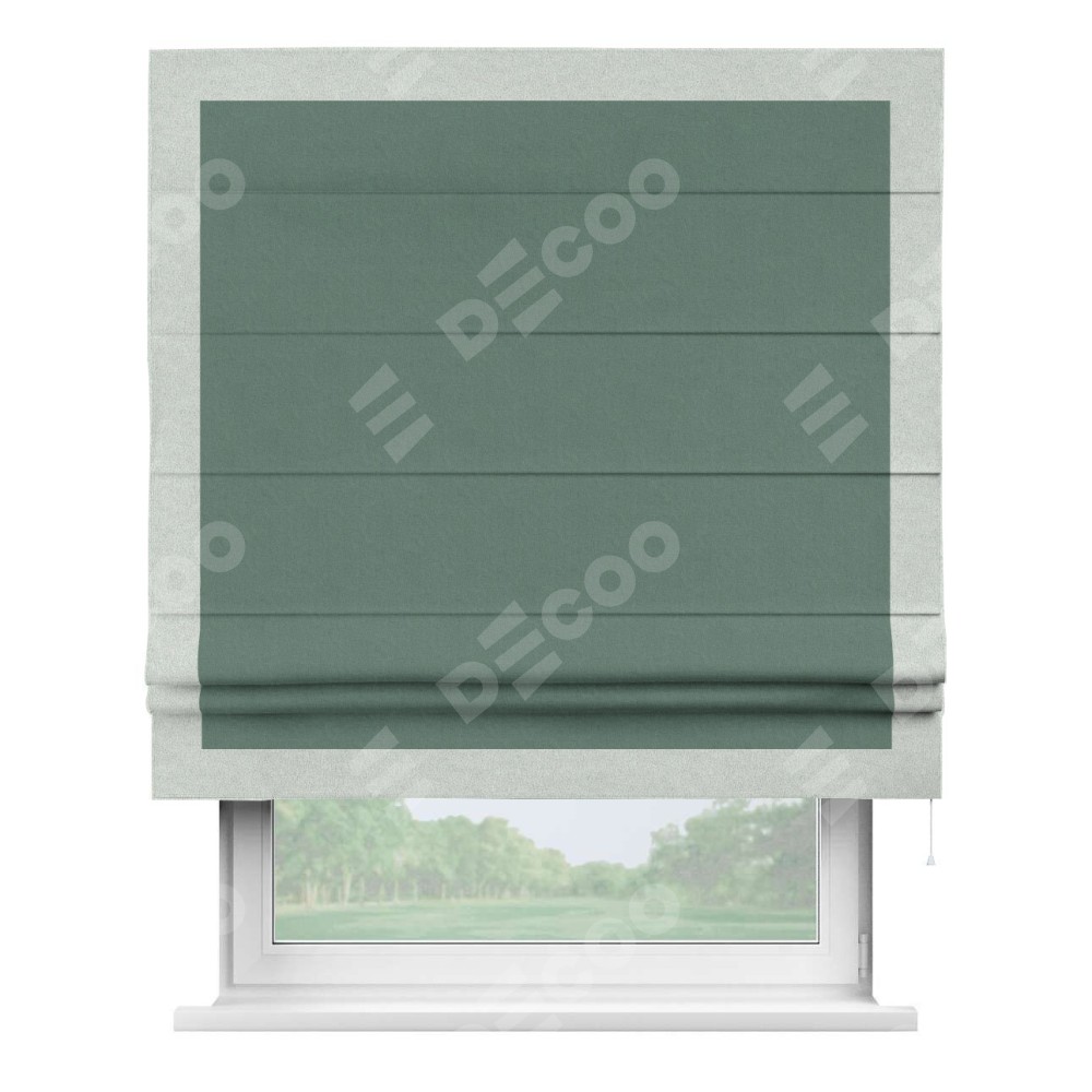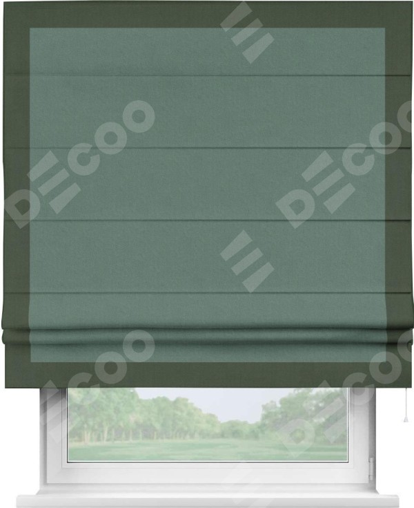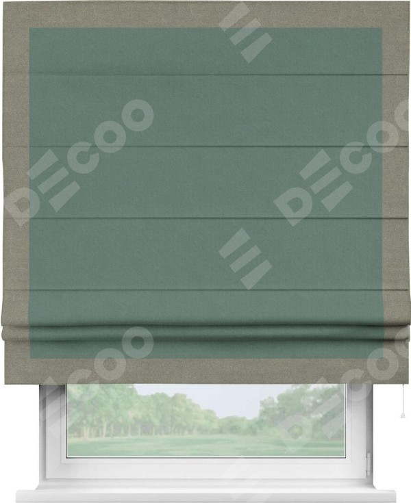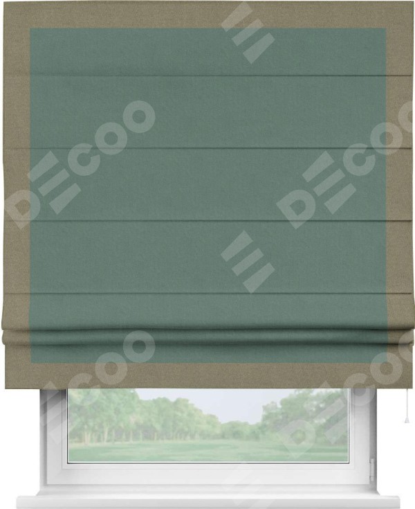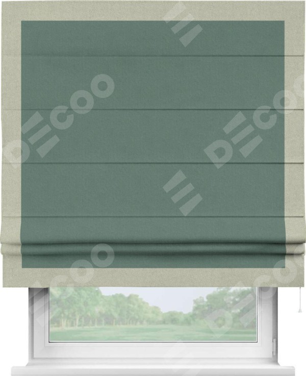 Римская штора производителя «Cortin», используется для проёма, пошита из ткани лён блэкаут бирюзовый, артикул 69517. Отделка шторы кантом «Чесс», ткань для канта используется из льна разной расцветки на выбор. Имеет универсальный механизм и подходит для монтажа: на потолок, на стену и в нишу.