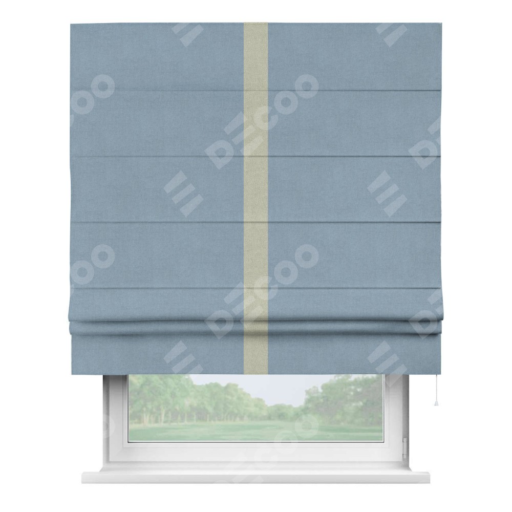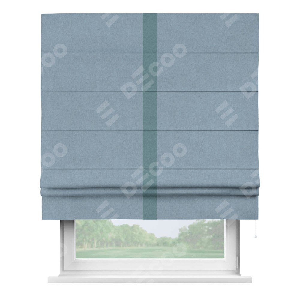 Римская штора производителя «Cortin», используется для проёма, пошита из ткани лён блэкаут голубой, артикул 69574. Отделка шторы кантом «Хайвэй», ткань для канта используется из льна разной расцветки на выбор. Имеет универсальный механизм и подходит для монтажа: на потолок, на стену и в нишу.