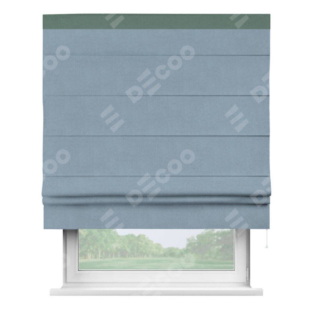 Римская штора производителя «Cortin», используется для проёма, пошита из ткани лён блэкаут голубой, артикул 69574. Отделка шторы кантом «Кинг», ткань для канта используется из льна разной расцветки на выбор. Имеет универсальный механизм и подходит для монтажа: на потолок, на стену и в нишу.