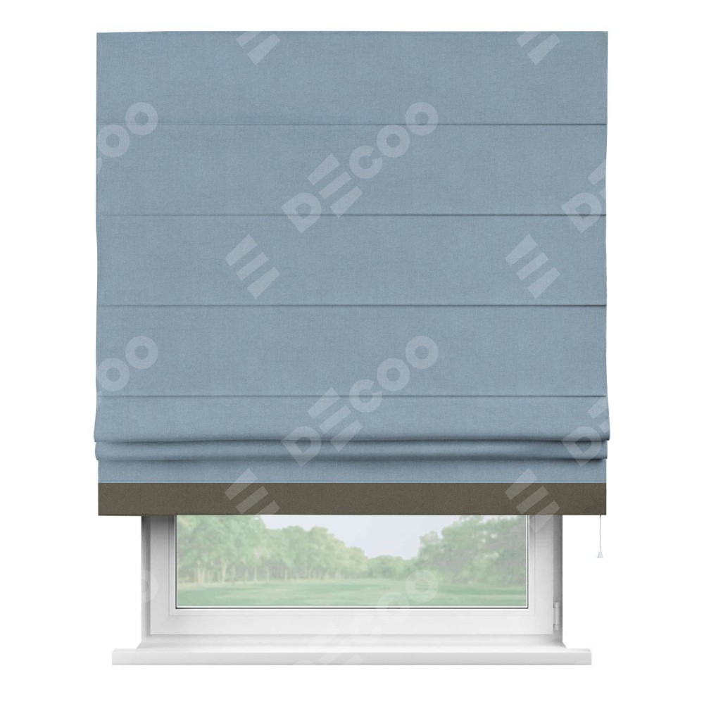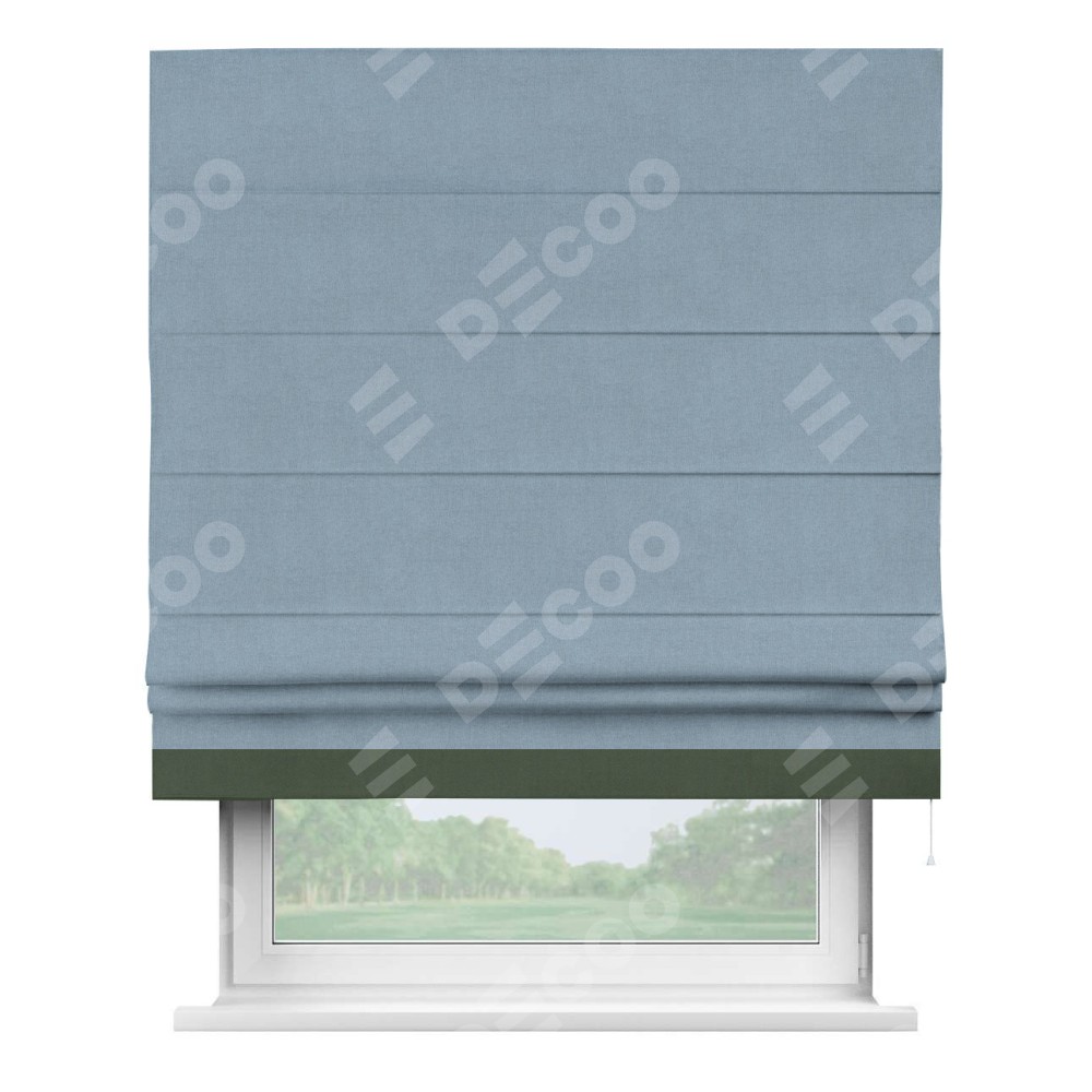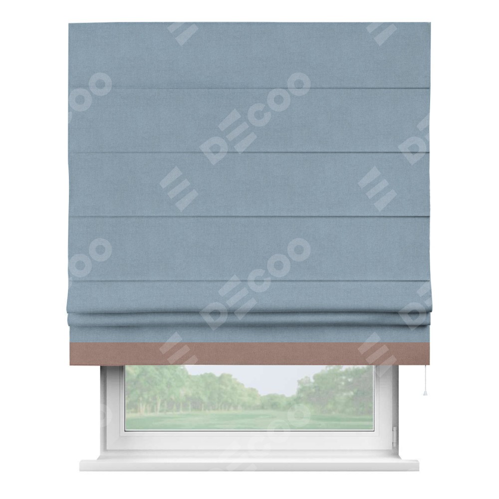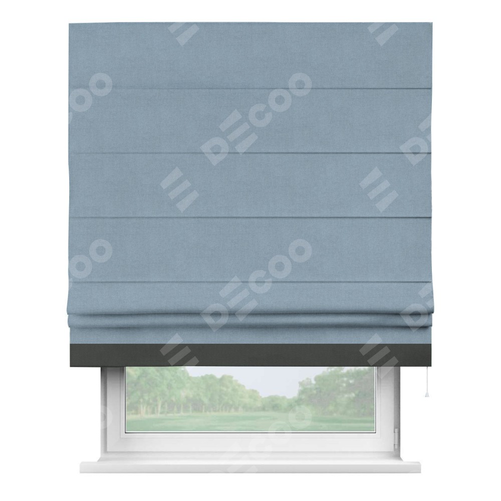 Римская штора производителя «Cortin», используется для проёма, пошита из ткани лён блэкаут голубой, артикул 69574. Отделка шторы кантом «Джестер», ткань для канта используется из льна разной расцветки на выбор. Имеет универсальный механизм и подходит для монтажа: на потолок, на стену и в нишу.