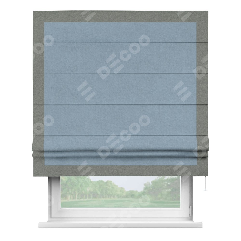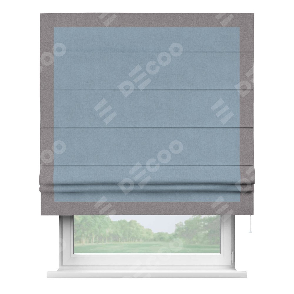 Римская штора производителя «Cortin», используется для проёма, пошита из ткани лён блэкаут голубой, артикул 69574. Отделка шторы кантом «Чесс», ткань для канта используется из льна разной расцветки на выбор. Имеет универсальный механизм и подходит для монтажа: на потолок, на стену и в нишу.