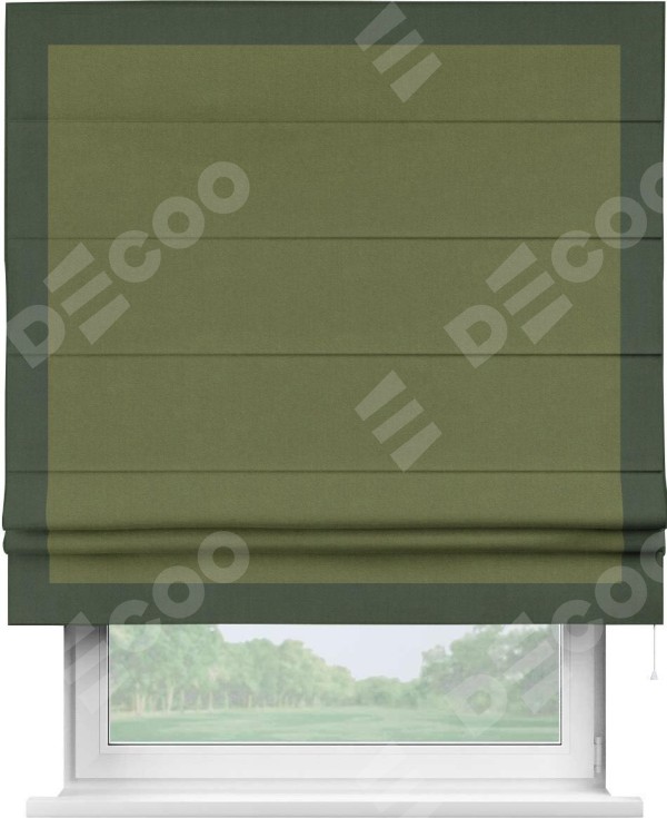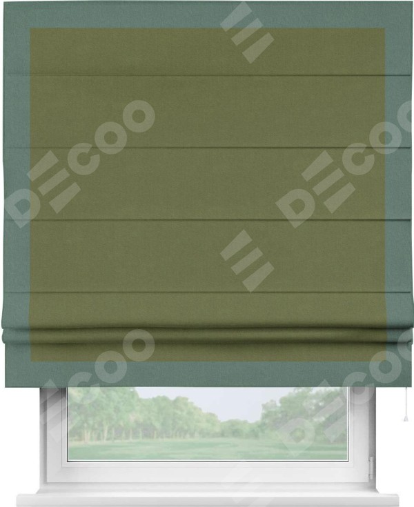 Римская штора производителя «Cortin», используется для проёма, пошита из ткани лён блэкаут оливковый, артикул 69516. Отделка шторы кантом «Чесс», ткань для канта используется из льна разной расцветки на выбор. Имеет универсальный механизм и подходит для монтажа: на потолок, на стену и в нишу.