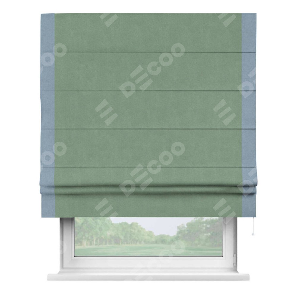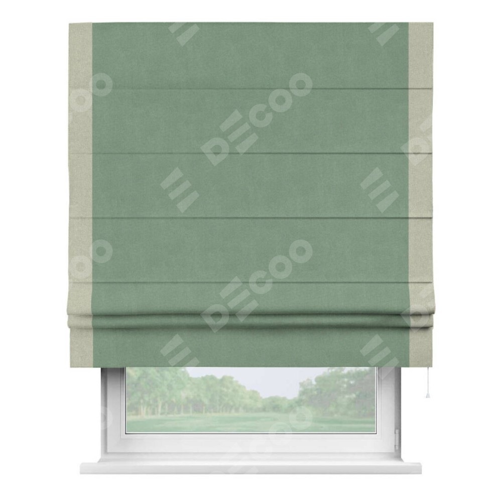 Римская штора производителя «Cortin», используется для проёма, пошита из ткани лён блэкаут светло-бирюзовый, артикул 69443. Отделка шторы кантом «Стрим Дуо», ткань для канта используется из льна разной расцветки на выбор. Имеет универсальный механизм и подходит для монтажа: на потолок, на стену и в нишу.