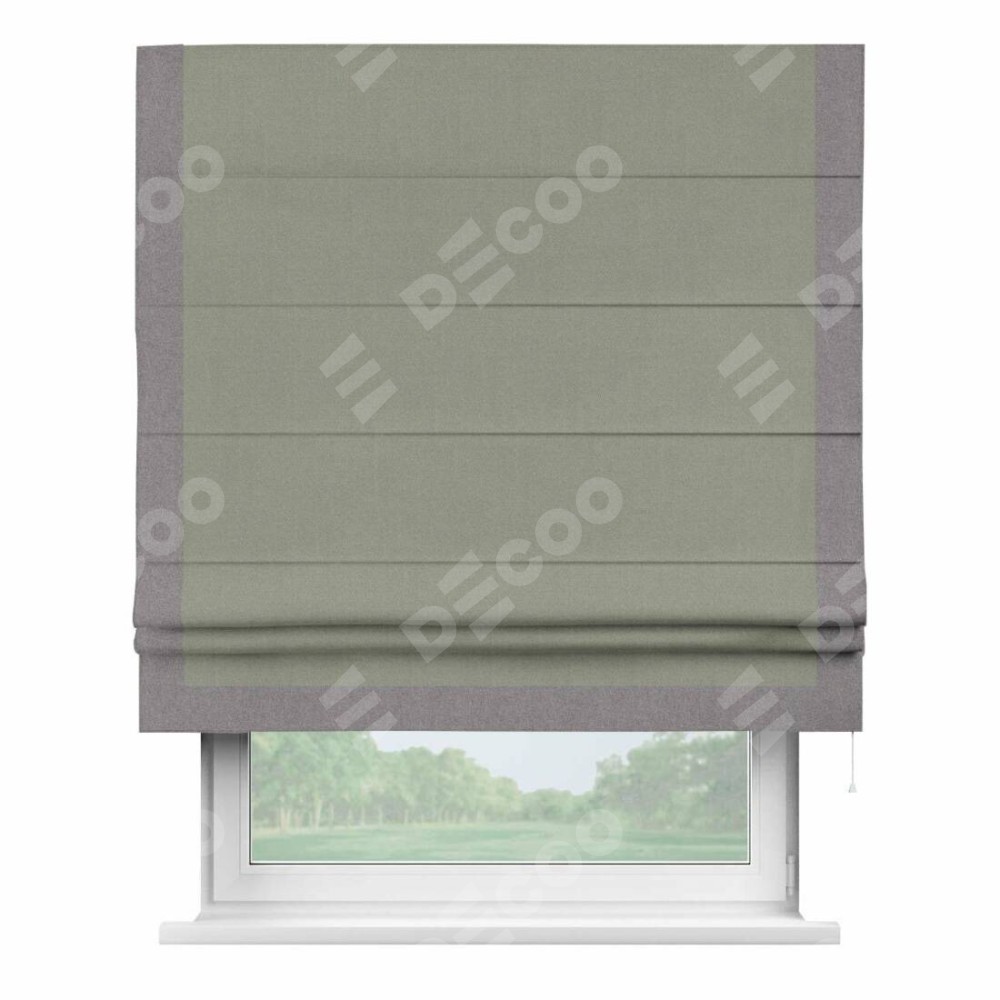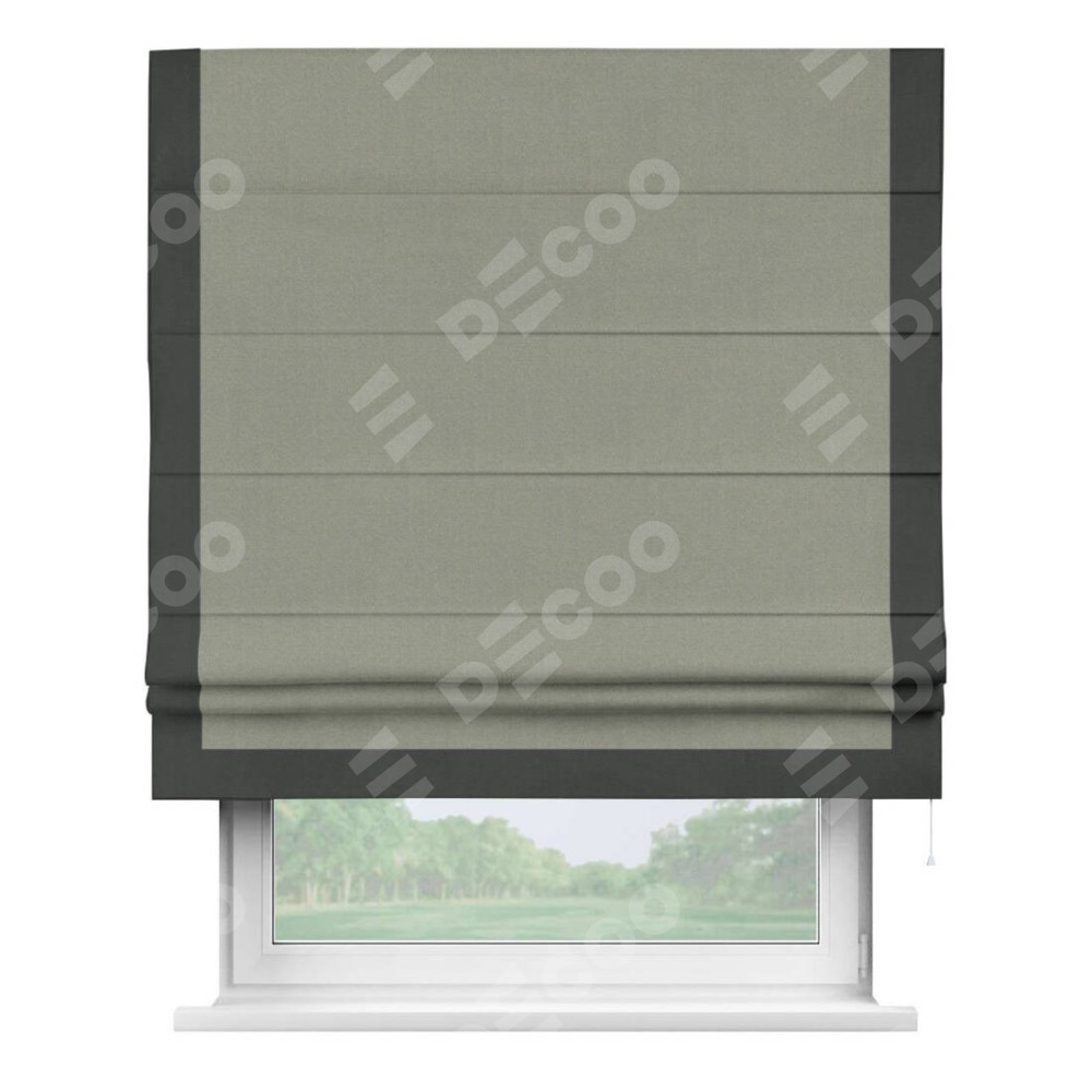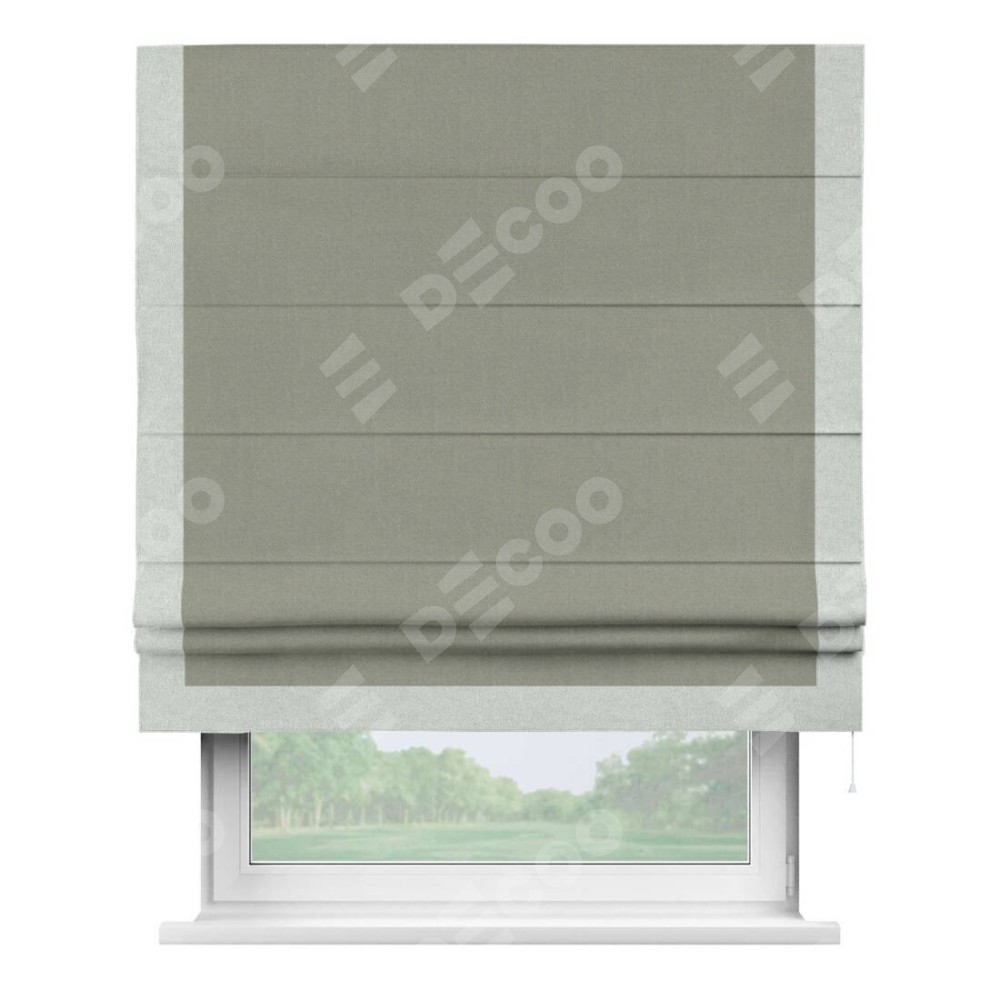 Римская штора производителя «Cortin», используется для проёма, пошита из ткани лён блэкаут светло-серый, артикул 69451. Отделка шторы кантом «Виктория», ткань для канта используется из льна разной расцветки на выбор. Имеет универсальный механизм и подходит для монтажа: на потолок, на стену и в нишу.