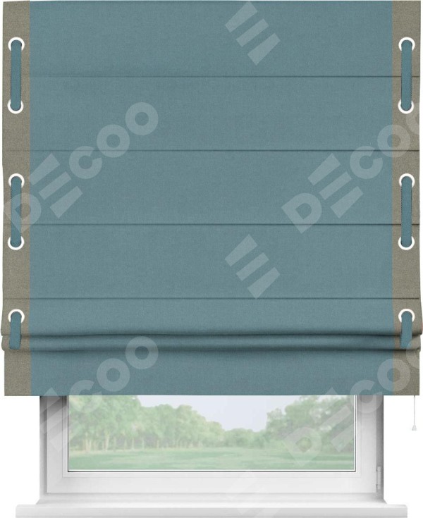 Римская штора производителя «Cortin», используется для проёма, пошита из ткани лён блэкаут синий, артикул 69528. Отделка шторы кантом «Стрим Дуо» на кантах расположены люверсы с пояском, ткань для канта используется из льна разной расцветки на выбор. Ткань для пояска обычно используется из основной ткани шторы, а так же можно сделать из любой расцветки по желанию. Имеет универсальный механизм и подходит для монтажа: на потолок, на стену и в нишу.