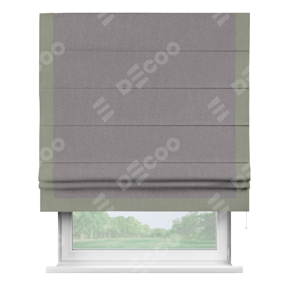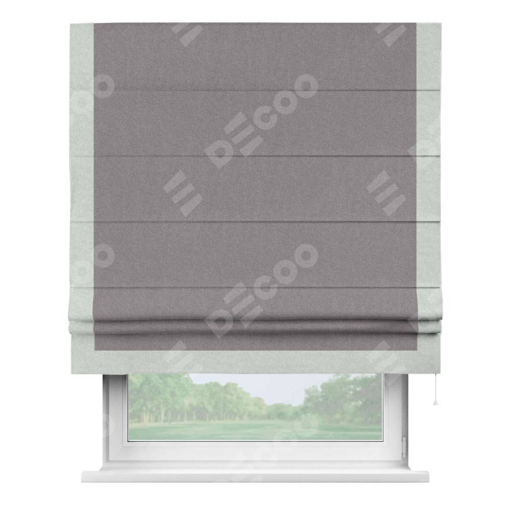 Римская штора производителя «Cortin», используется для проёма, пошита из ткани лён блэкаут сиреневый, артикул 69576. Отделка шторы кантом «Виктория», ткань для канта используется из льна разной расцветки на выбор. Имеет универсальный механизм и подходит для монтажа: на потолок, на стену и в нишу.