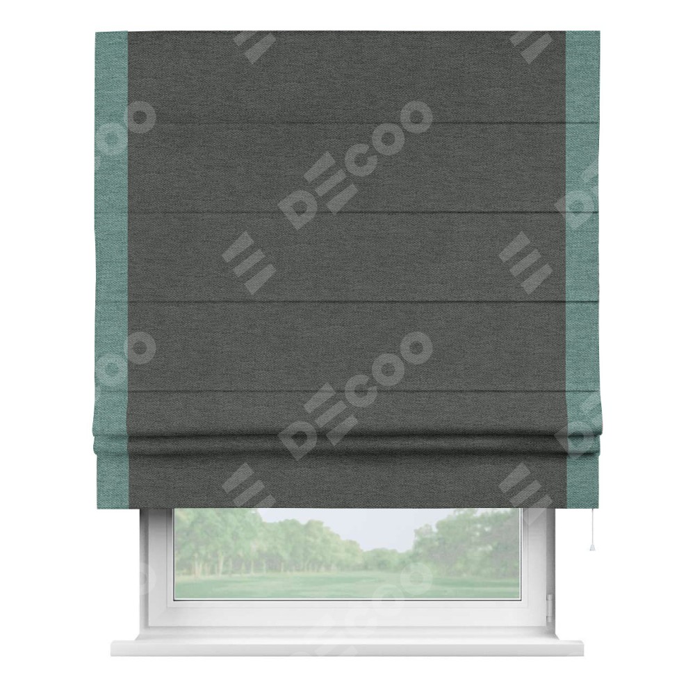 Римская штора производителя «Cortin», используется для проёма, пошита из ткани стиф димаут графит, артикул 44026. Отделка шторы кантом «Стрим Дуо», ткань для канта используется из стифа разной расцветки на выбор. Имеет универсальный механизм и подходит для монтажа: на потолок, на стену и в нишу.