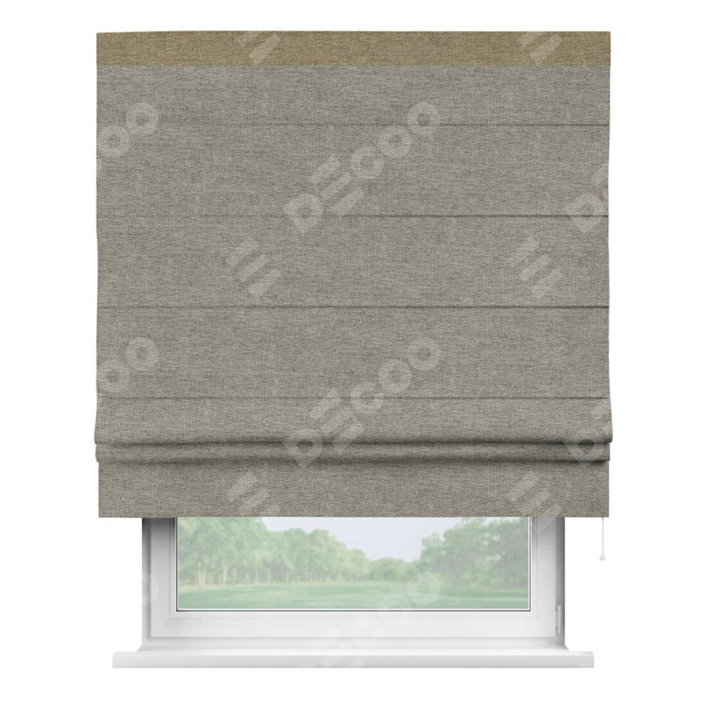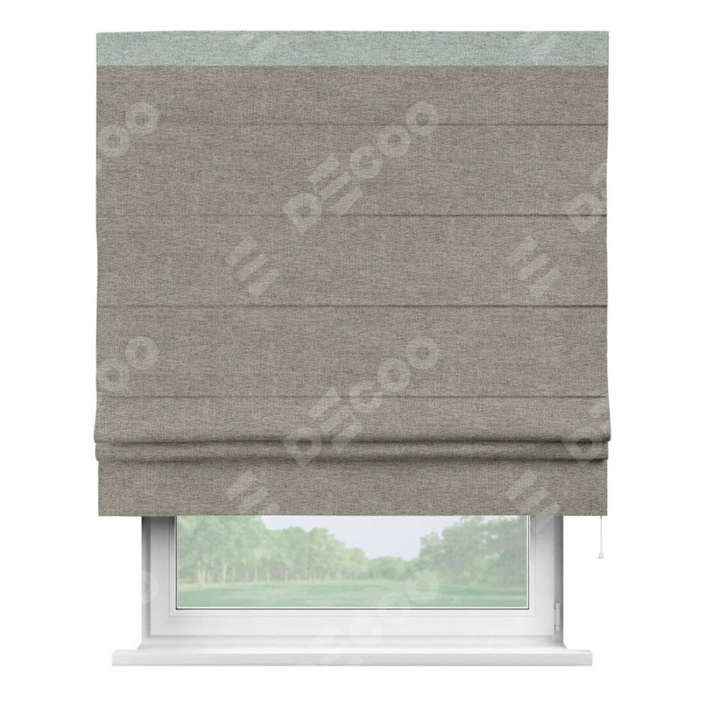 Римская штора производителя «Cortin», используется для проёма, пошита из ткани стиф димаут серо-коричневый, артикул 44028. Отделка шторы кантом «Кинг», ткань для канта используется из стифа разной расцветки на выбор. Имеет универсальный механизм и подходит для монтажа: на потолок, на стену и в нишу.