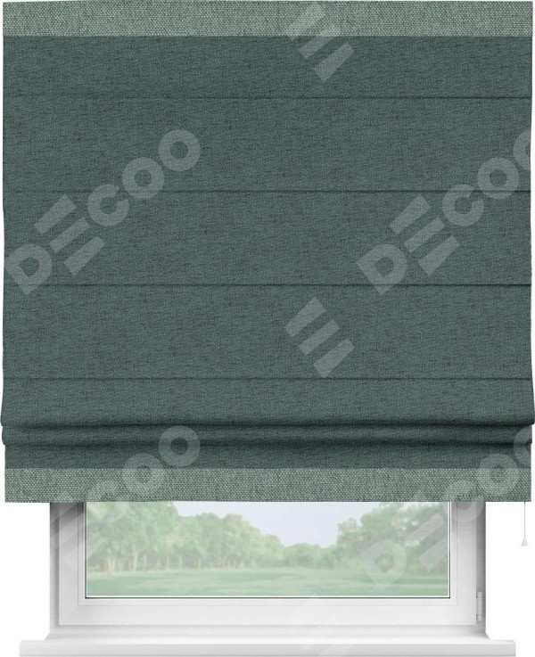 Римская штора производителя «Cortin», используется для проёма, пошита из ткани стиф димаут сине-зелёный, артикул 18194. Отделка шторы кантом «Горизонт», ткань для канта используется из стифа разной расцветки на выбор. Имеет универсальный механизм и подходит для монтажа: на потолок, на стену и в нишу.