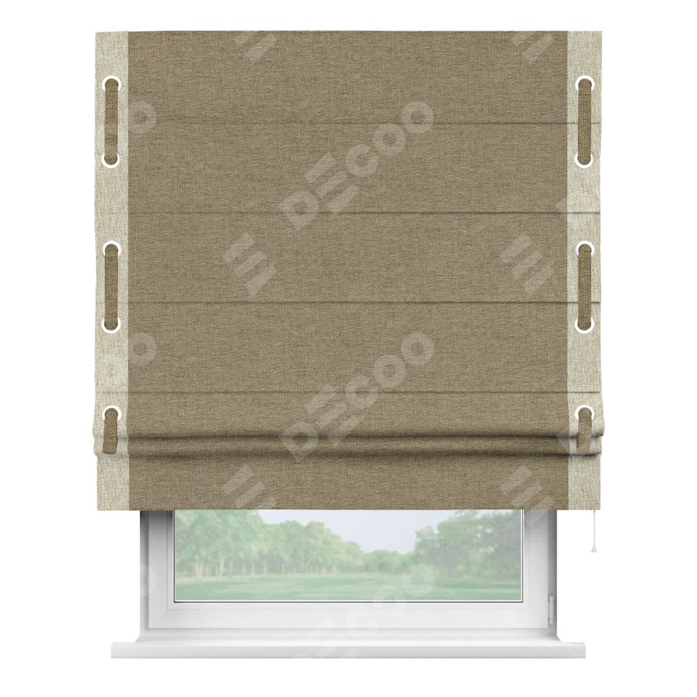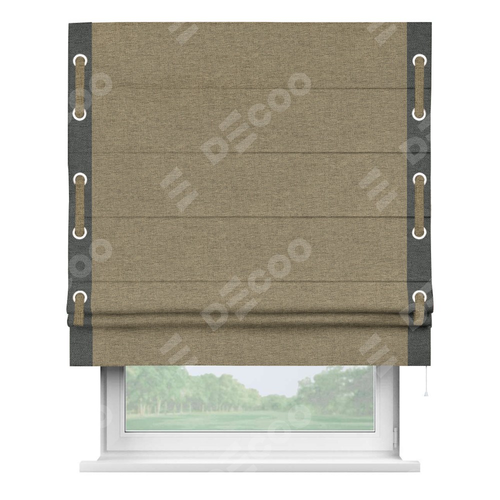 Римская штора производителя «Cortin», используется для проёма, пошита из ткани стиф димаут тёмно-бежевый, артикул 18085. Отделка шторы кантом «Стрим Дуо» на кантах расположены люверсы с пояском, ткань для канта используется из стифа разной расцветки на выбор. Ткань для пояска обычно используется из основной ткани шторы, а так же можно сделать из любой расцветки по желанию. Имеет универсальный механизм и подходит для монтажа: на потолок, на стену и в нишу.