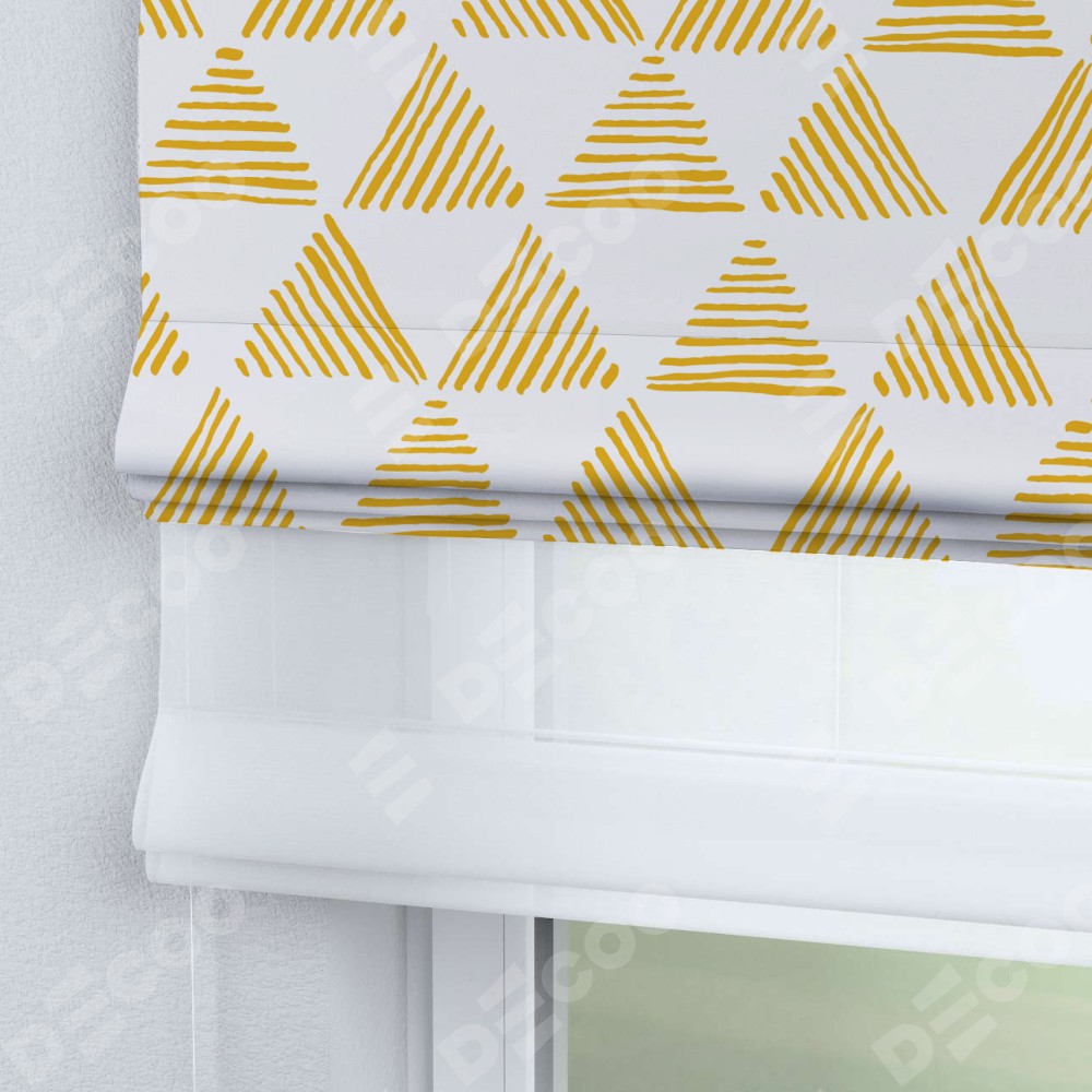 Римская штора день-ночь производителя «Cortin», используется для проёма, пошита из двух полотен, с лицевой блэкаут с нанесением сублимационной печати «Желтые треугольники», вторая ткань тюль (по стандарту комплектуется тюль белого цвета артикул V-01). Имеет универсальный механизм и подходит для монтажа: на потолок, на стену и в нишу.