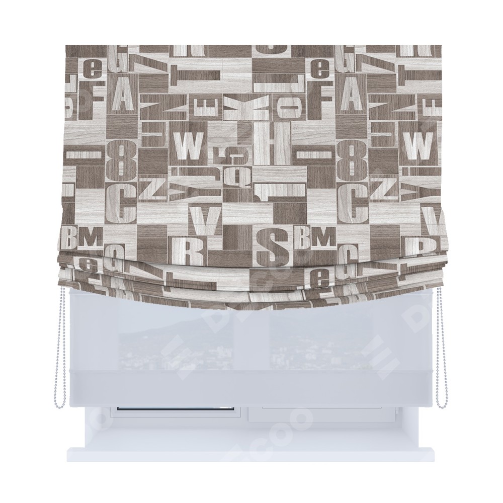Римская штора день-ночь производителя «Cortin», используется для проёма, пошита из двух полотен, с лицевой блэкаут с нанесением сублимационной печати «Литеры лофт», вторая ткань тюль (по стандарту комплектуется тюль белого цвета артикул V-01). Имеет универсальный механизм и подходит для монтажа: на потолок, на стену и в нишу. Удобное управление каждой шторой отдельно.
