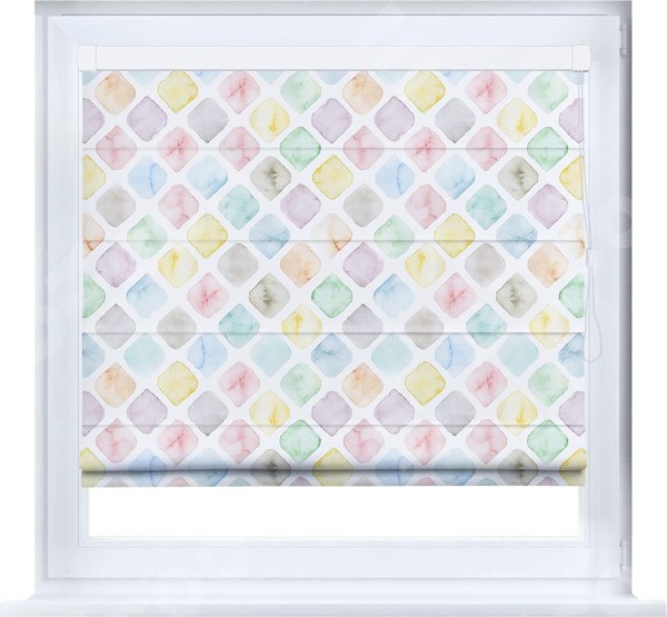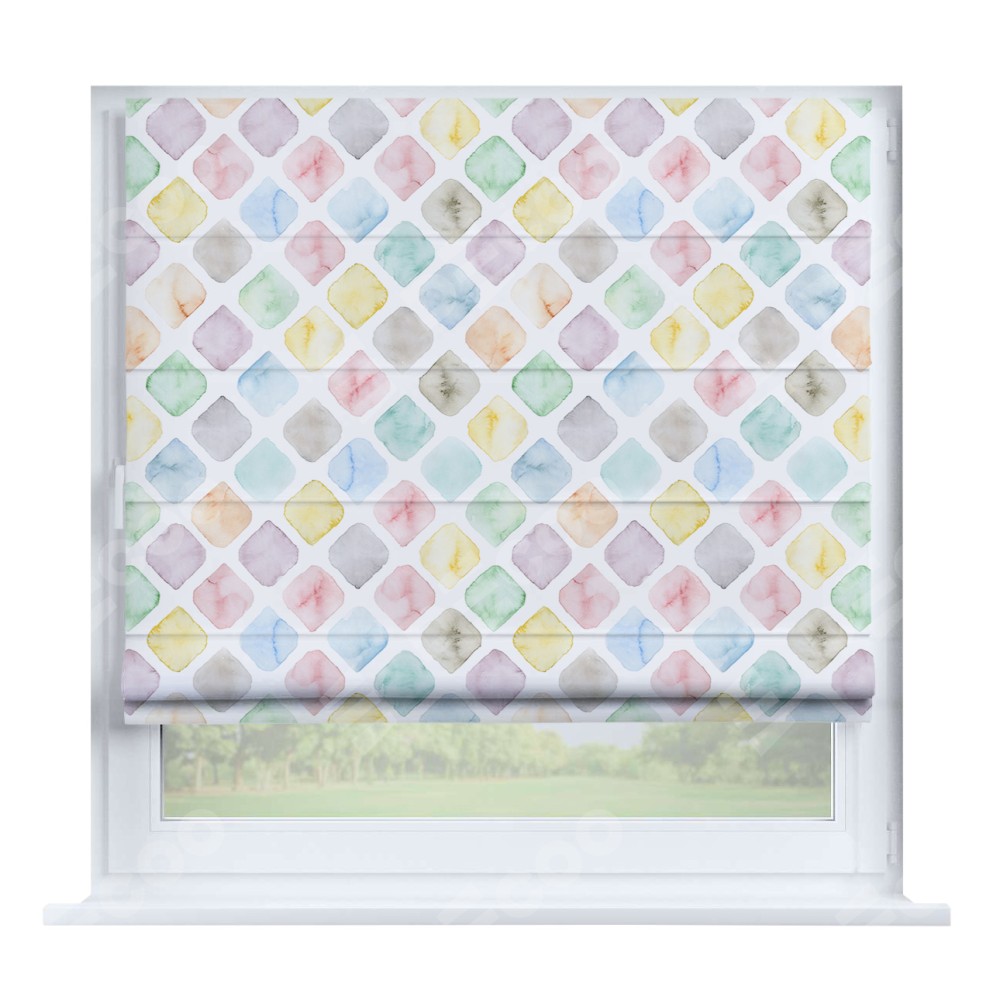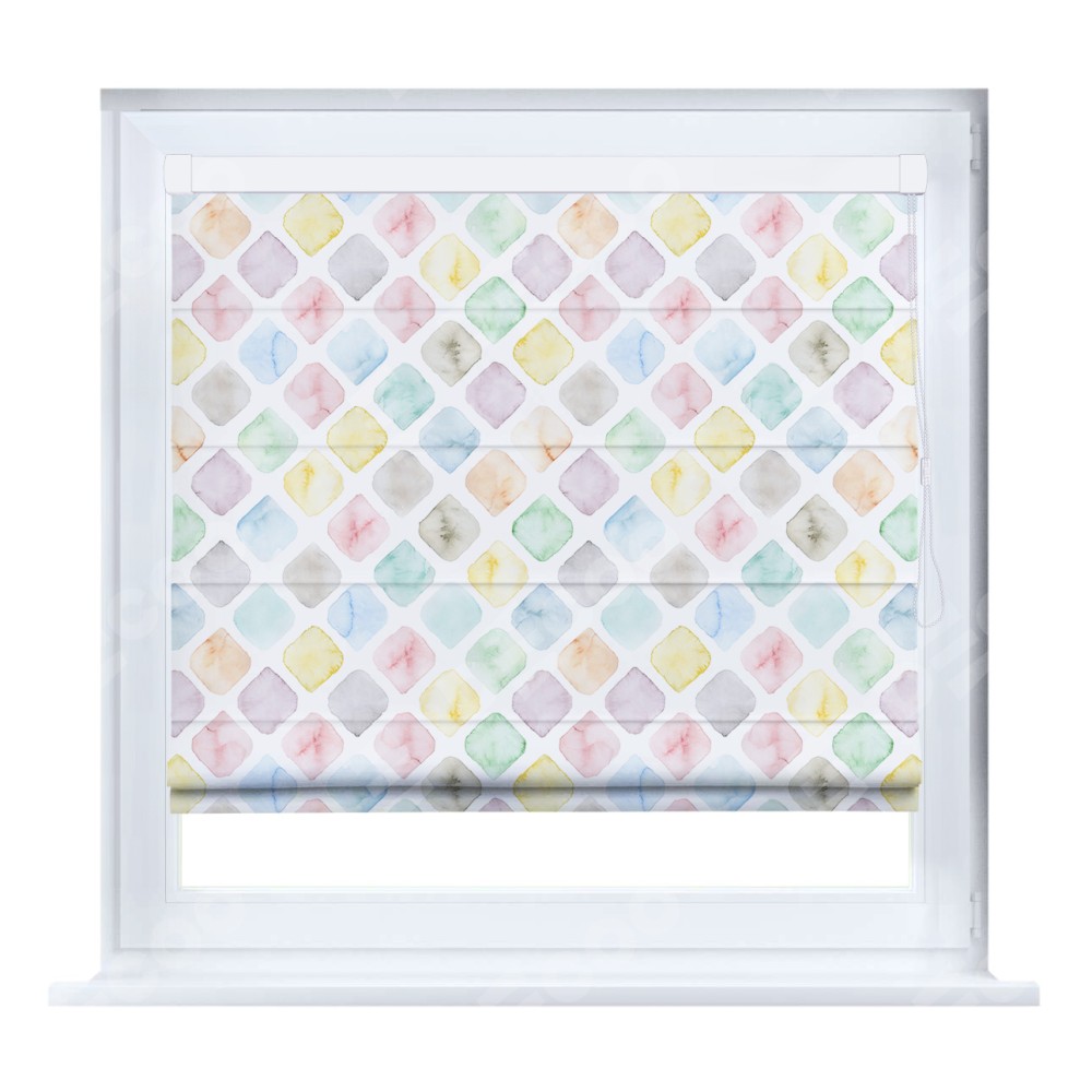Римская штора производителя «Cortin», устанавливается на створку окна, пошита из ткани блэкаут с нанесением сублимационной печати «Мозаика акварель». Штора шьётся по индивидуальным размерам, для данного типа римской шторы возможная ширина от 35 до 150 см., высота до 250 см.