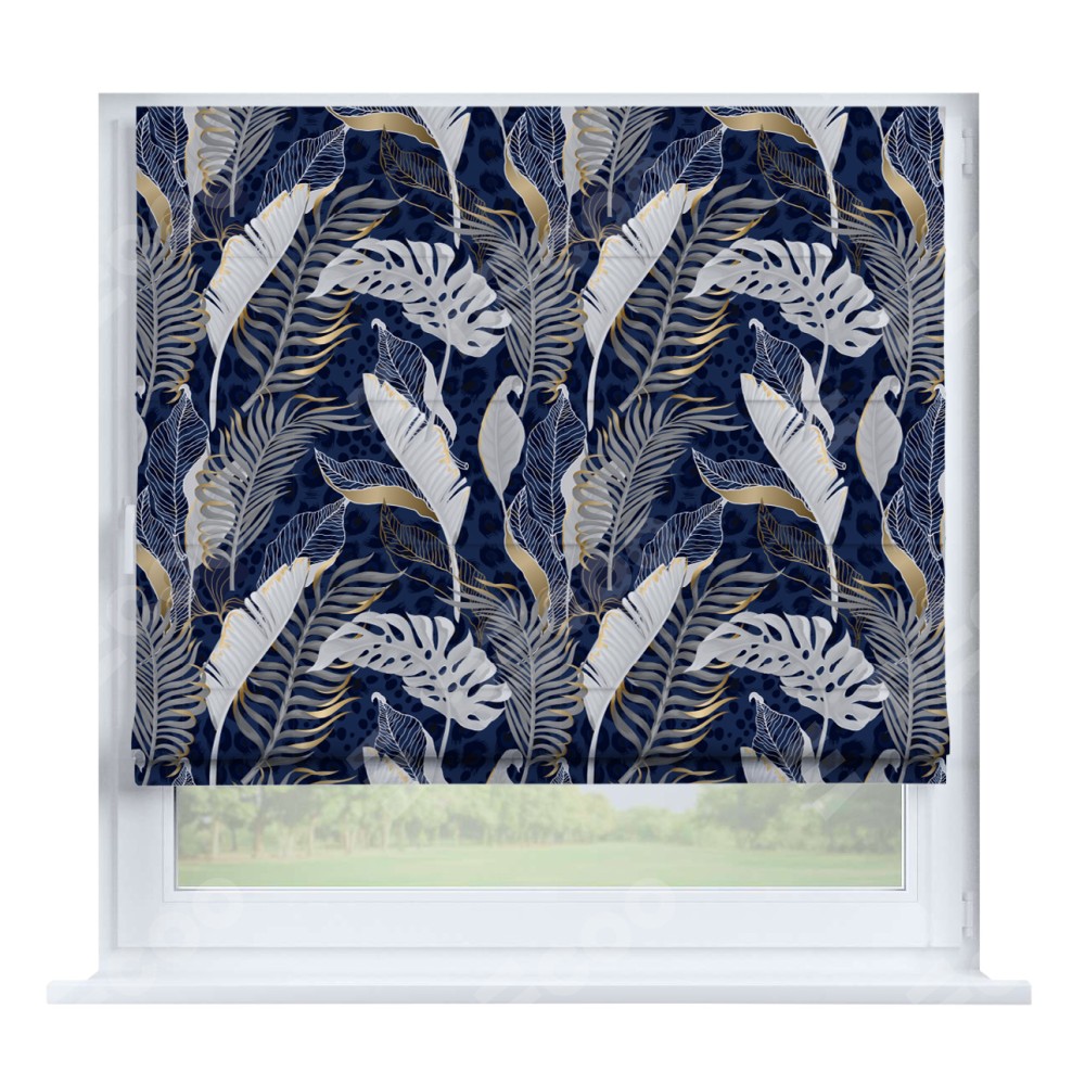Римская штора производителя «Cortin», устанавливается на створку окна, пошита из ткани блэкаут с нанесением сублимационной печати «Сине-золотые джунгли». Штора шьётся по индивидуальным размерам, для данного типа римской шторы возможная ширина от 35 до 150 см., высота до 250 см.