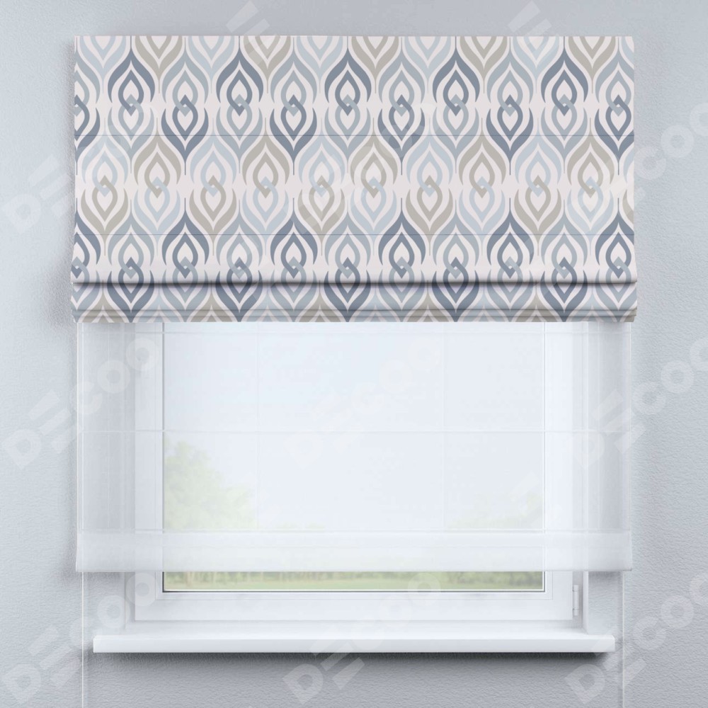 Римская штора день-ночь производителя «Cortin», используется для проёма, пошита из двух полотен, с лицевой блэкаут с нанесением сублимационной печати «Элизиум», вторая ткань тюль (по стандарту комплектуется тюль белого цвета артикул V-01). Имеет универсальный механизм и подходит для монтажа: на потолок, на стену и в нишу.