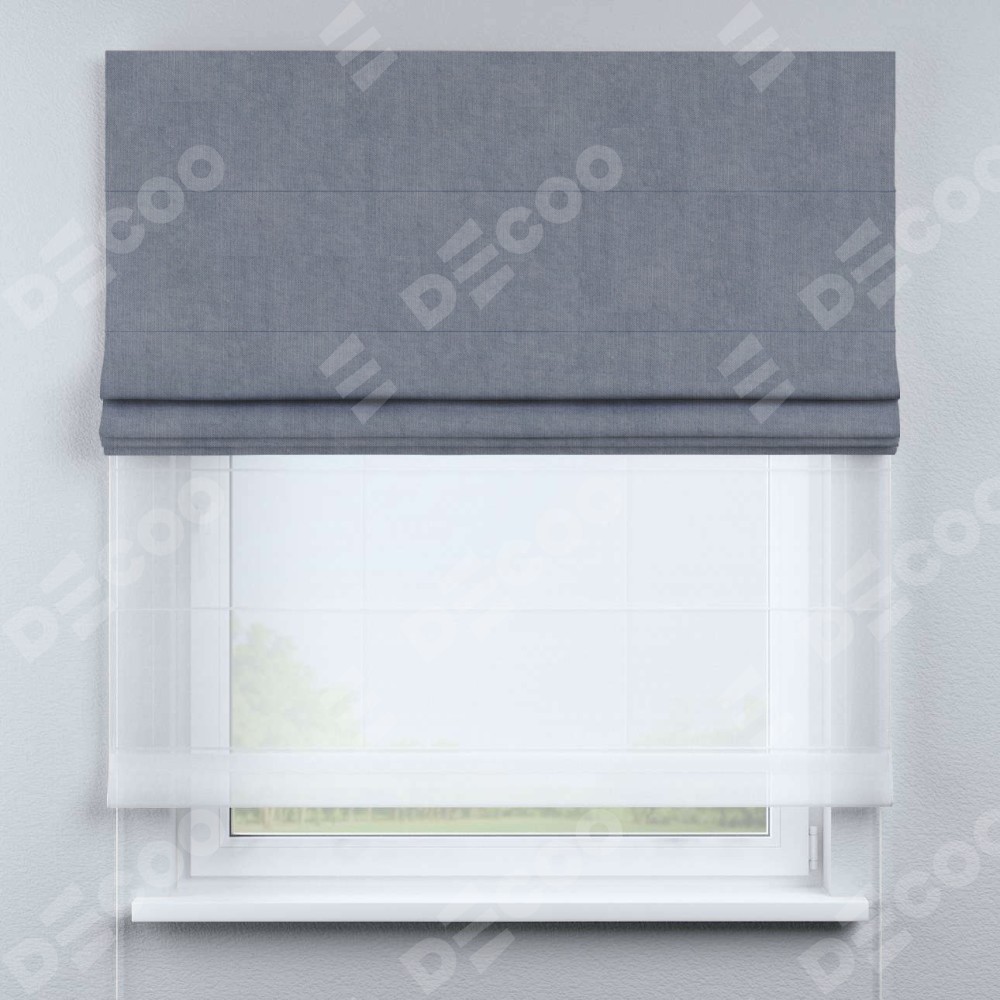 Римская штора день-ночь производителя «Cortin», используется для проёма, пошита из двух полотен, с лицевой стороны канвас васильковый артикул v-203, вторая ткань тюль (по стандарту комплектуется тюль белого цвета артикул V-01). Имеет универсальный механизм и подходит для монтажа: на потолок, на стену и в нишу.