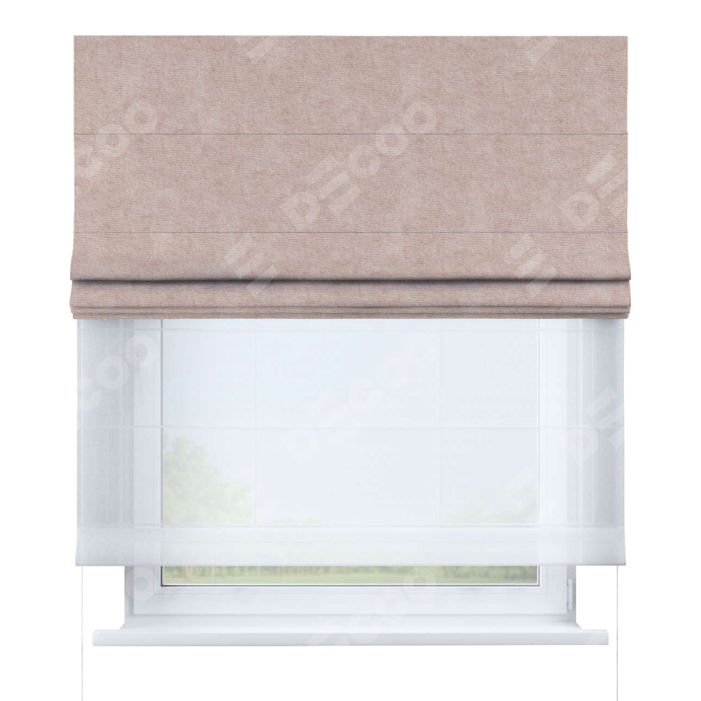 Римская штора день-ночь производителя «Cortin», используется для проёма, пошита из двух полотен, с лицевой стороны канвас пудровый артикул v-35, вторая ткань тюль (по стандарту комплектуется тюль белого цвета артикул V-01). Имеет универсальный механизм и подходит для монтажа: на потолок, на стену и в нишу.