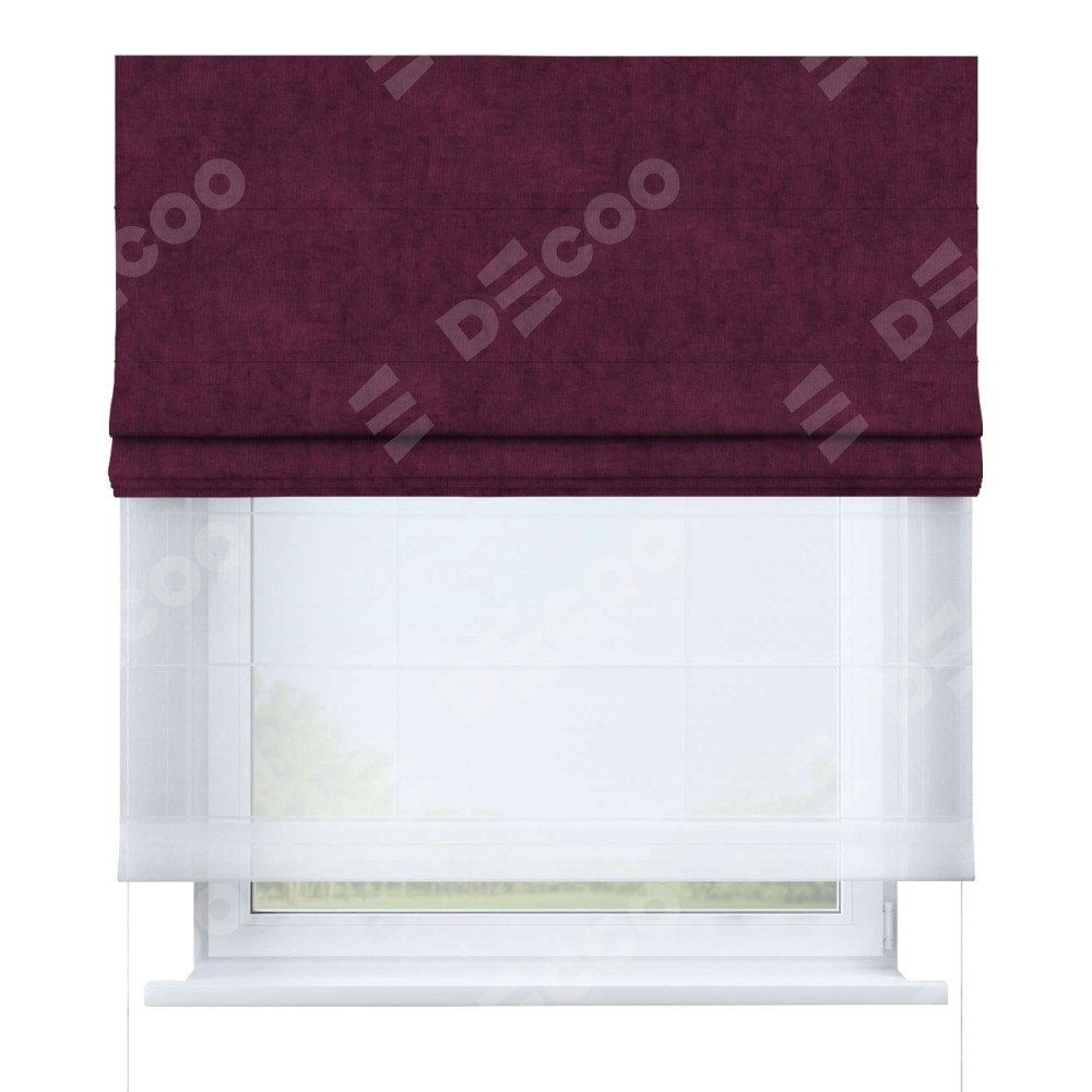 Римская штора день-ночь производителя «Cortin», используется для проёма, пошита из двух полотен, с лицевой стороны канвас фиолетовый артикул v-99, вторая ткань тюль (по стандарту комплектуется тюль белого цвета артикул V-01). Имеет универсальный механизм и подходит для монтажа: на потолок, на стену и в нишу.
