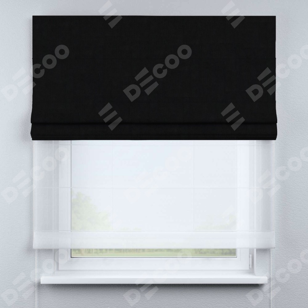Римская штора день-ночь производителя «Cortin», используется для проёма, пошита из двух полотен, с лицевой стороны канвас канвас черный v-194, вторая ткань тюль (по стандарту комплектуется тюль белого цвета артикул V-01). Имеет универсальный механизм и подходит для монтажа: на потолок, на стену и в нишу.