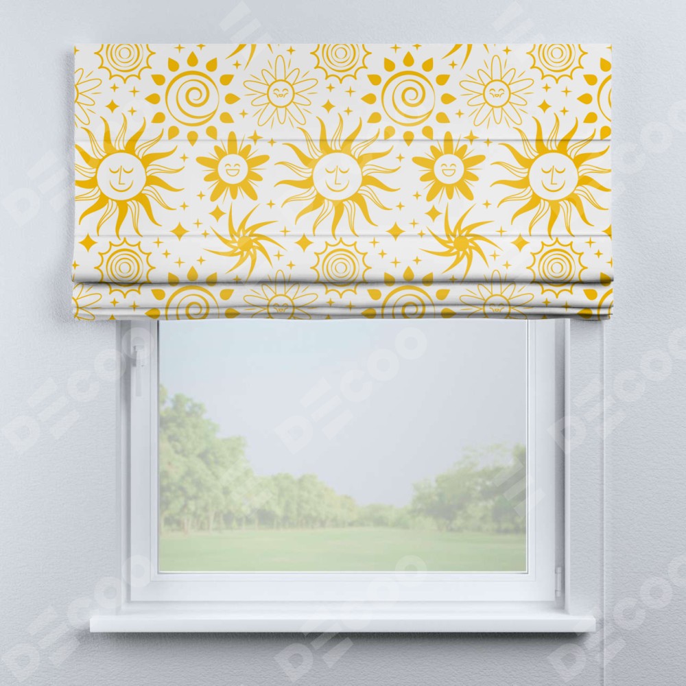 Римская штора производителя «Cortin», используется для проёма, пошита из ткани блэкаут с нанесением сублимационной печати «Солнышки». Имеет универсальный механизм и подходит для монтажа: на потолок, на стену и в нишу.
