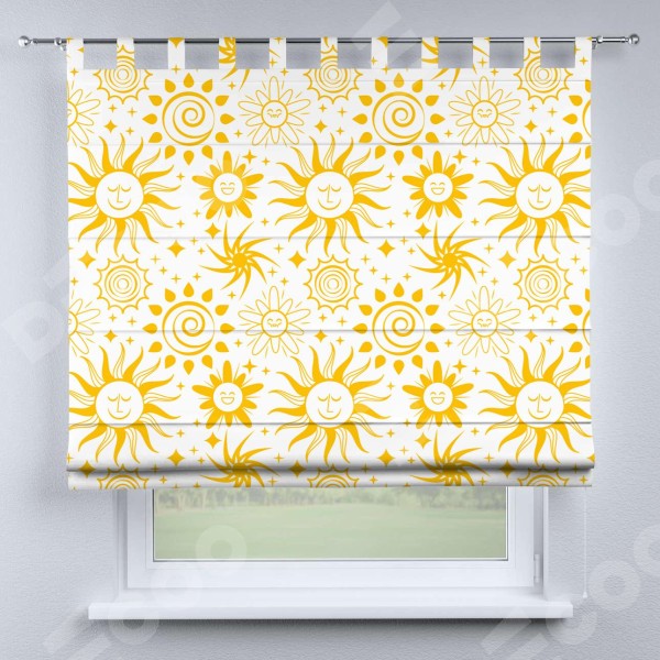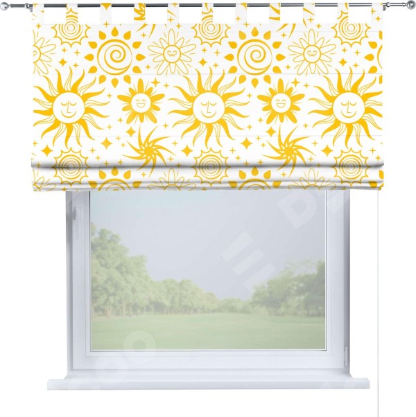 Римская штора производителя «Cortin», используется для проёма, пошита из ткани блэкаут с нанесением сублимационной печати «Солнышки». Данная модель пошита на петлях, комплектуется на выбор круглым карнизом и подходит для монтажа на стену. Римская штора на петлях имеет простую систему регулировки высоты, отличительным преимуществом данной модели является простой способ монтажа. Достаточно повесить ее на трубу и штора готова!