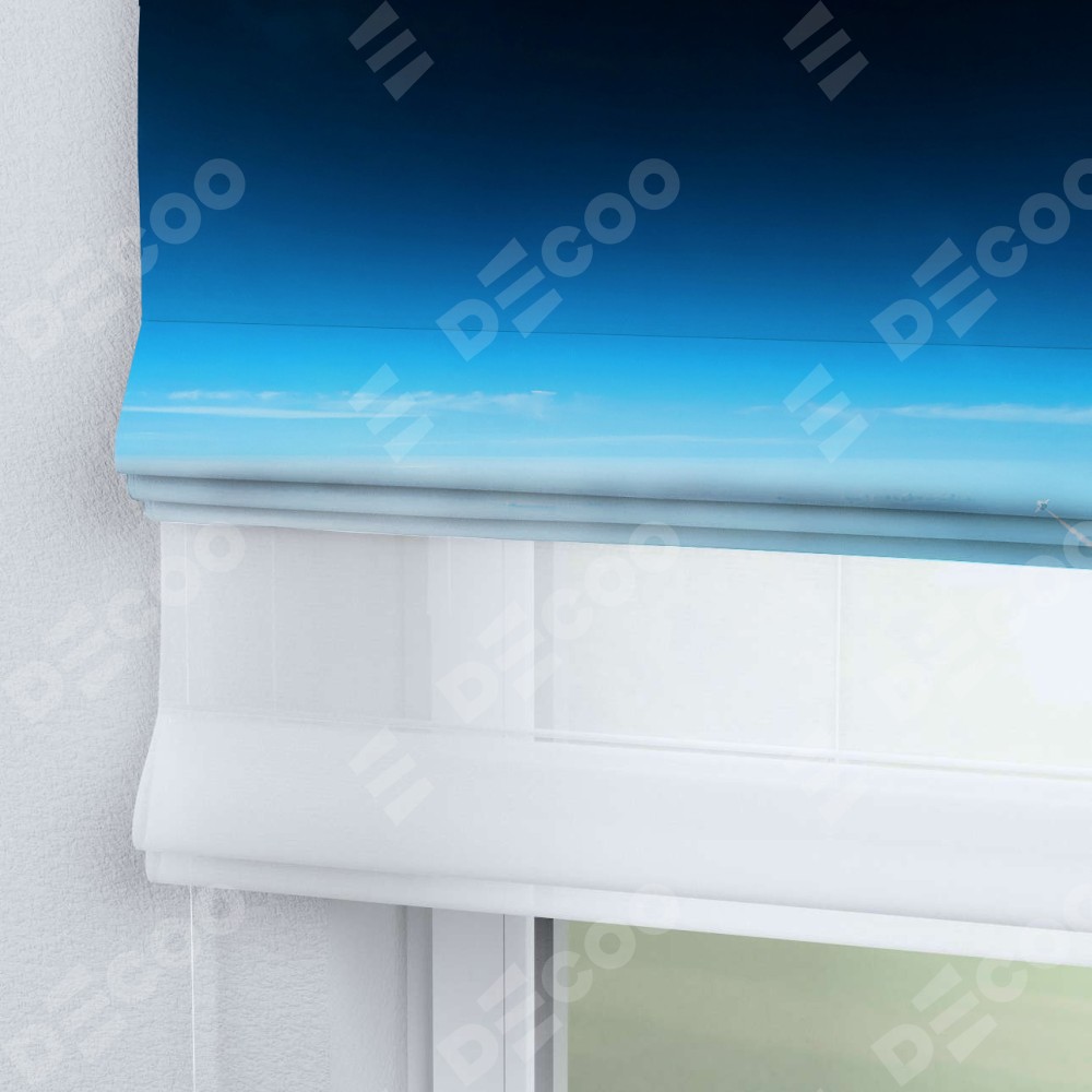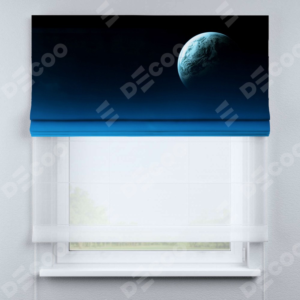Римская штора день-ночь производителя «Cortin», используется для проёма, пошита из двух полотен, с лицевой блэкаут с нанесением сублимационной печати «Горизонты вселенной», вторая ткань тюль (по стандарту комплектуется тюль белого цвета артикул V-01). Имеет универсальный механизм и подходит для монтажа: на потолок, на стену и в нишу.