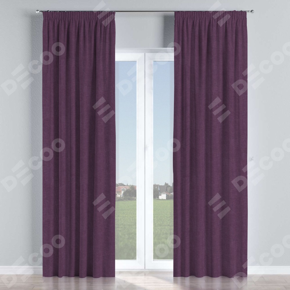 Комплект прямых штор, от производителя «Cortin», пошиты из ткани канвас баклажановый, артикул ткани v-111. С изнаночной стороны в верхней части штор пристрачивается шторная лента с декоративными складками «Карандаш». Для создания элегантных складок прямые шторы шьются по стандарту с коэффициентом 1:2 (на 100 см. ширины проёма 200 см. ширины ткани).