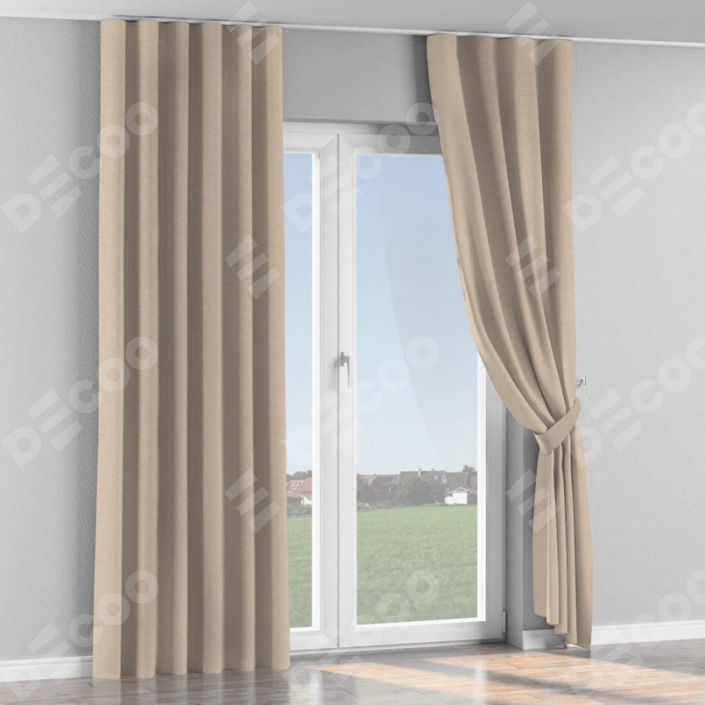 Комплект прямых штор, от производителя «Cortin», пошиты из ткани канвас кофе с молоком, артикул ткани v-07. С изнаночной стороны в верхней части штор пристрачивается шторная лента с декоративными складками «Волна». Для создания элегантных складок прямые шторы шьются по стандарту с коэффициентом 1:2 (на 100 см. ширины проёма 200 см. ширины ткани).