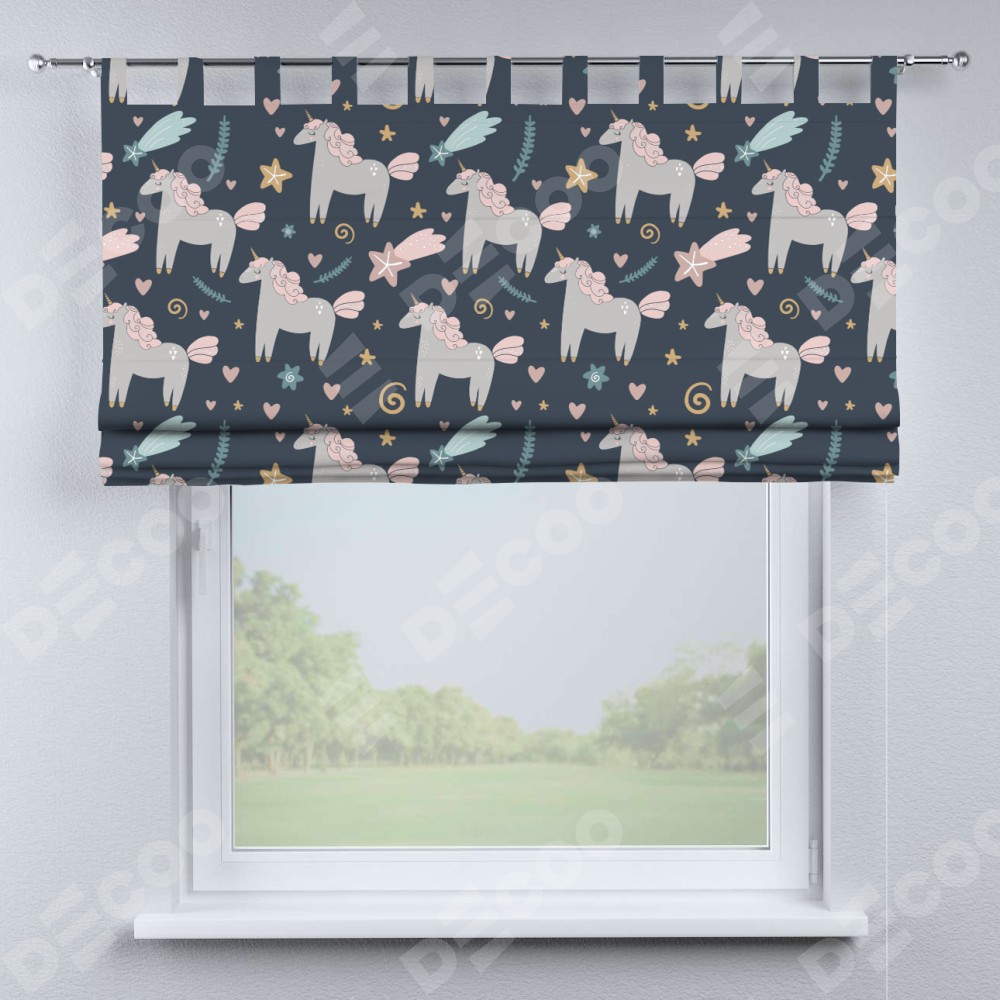 Римская штора производителя «Cortin», используется для проёма, пошита из ткани блэкаут с нанесением сублимационной печати «Милые единороги». Данная модель пошита на петлях, комплектуется на выбор круглым карнизом и подходит для монтажа на стену. Римская штора на петлях имеет простую систему регулировки высоты, отличительным преимуществом данной модели является простой способ монтажа. Достаточно повесить ее на трубу и штора готова!