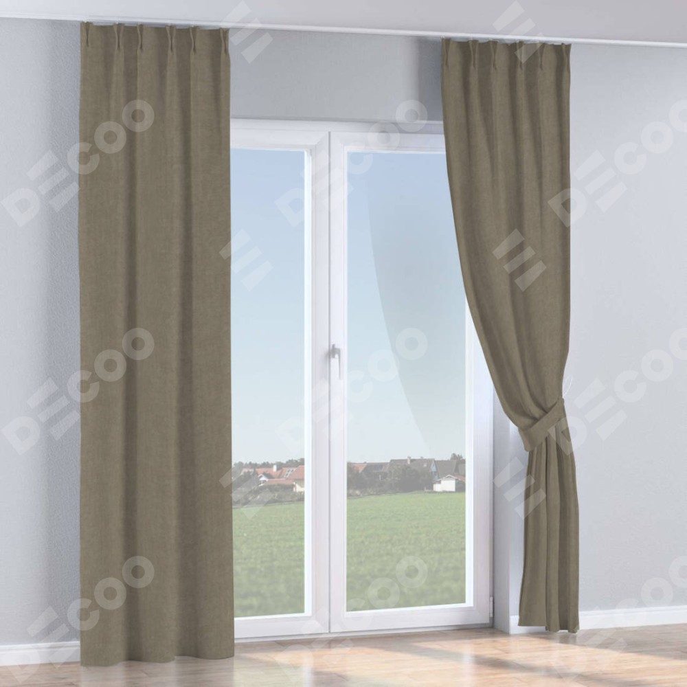 Комплект прямых штор, от производителя «Cortin», пошиты из ткани канвас серо-бежевый, артикул ткани v-224. С изнаночной стороны в верхней части штор пристрачивается шторная лента с декоративными складками «Кустик». Для создания элегантных складок прямые шторы шьются по стандарту с коэффициентом 1:2 (на 100 см. ширины проёма 200 см. ширины ткани).