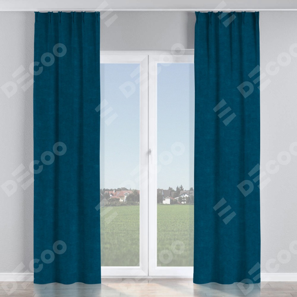Комплект прямых штор, от производителя «Cortin», пошиты из ткани канвас синий, артикул ткани v-573. С изнаночной стороны в верхней части штор пристрачивается шторная лента с декоративными складками «Кустик». Для создания элегантных складок прямые шторы шьются по стандарту с коэффициентом 1:2 (на 100 см. ширины проёма 200 см. ширины ткани).
