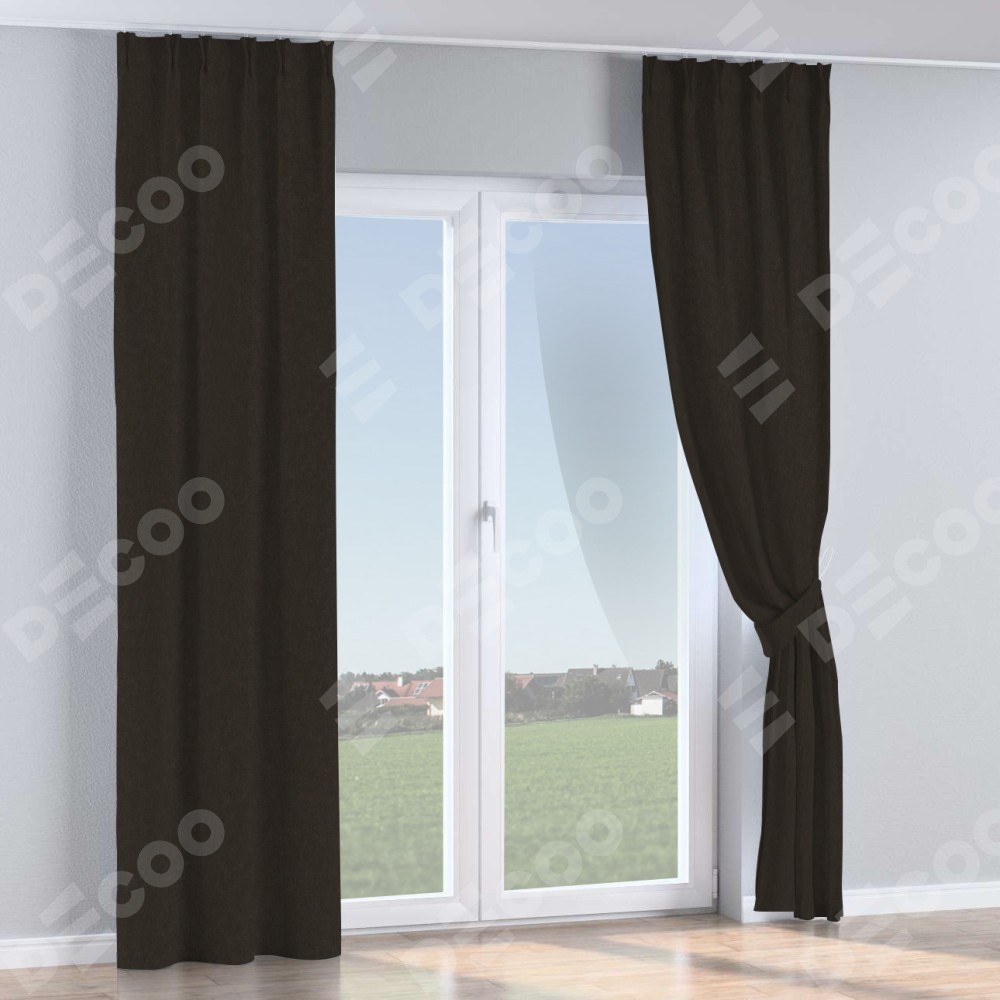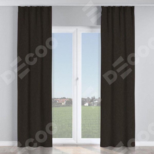 Комплект прямых штор, от производителя «Cortin», пошиты из ткани канвас тёмно-коричневый, артикул ткани v-13. С изнаночной стороны в верхней части штор пристрачивается шторная лента с декоративными складками «Кустик». Для создания элегантных складок прямые шторы шьются по стандарту с коэффициентом 1:2 (на 100 см. ширины проёма 200 см. ширины ткани).