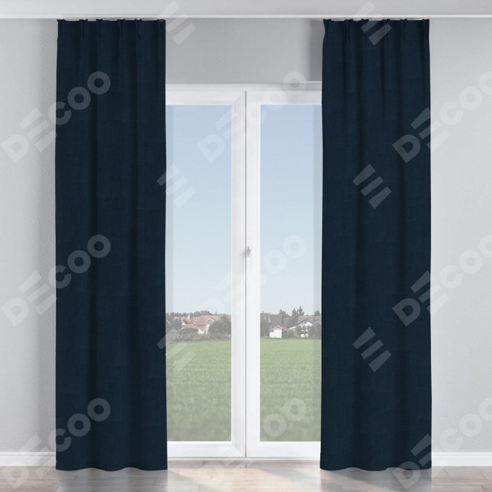 Комплект прямых штор, от производителя «Cortin», пошиты из ткани канвас тёмно-синий, артикул ткани v-206. С изнаночной стороны в верхней части штор пристрачивается шторная лента с декоративными складками «Кустик». Для создания элегантных складок прямые шторы шьются по стандарту с коэффициентом 1:2 (на 100 см. ширины проёма 200 см. ширины ткани).