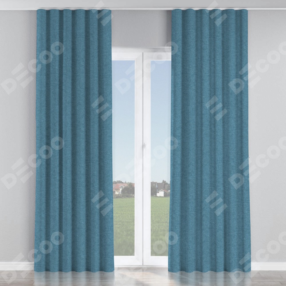 Комплект прямых штор, от производителя «Cortin», пошиты из ткани твид блэкаут светло-синий, артикул ткани 90935. С изнаночной стороны в верхней части штор пристрачивается шторная лента с декоративными складками «Волна». Для создания элегантных складок прямые шторы шьются по стандарту с коэффициентом 1:2 (на 100 см. ширины проёма 200 см. ширины ткани).