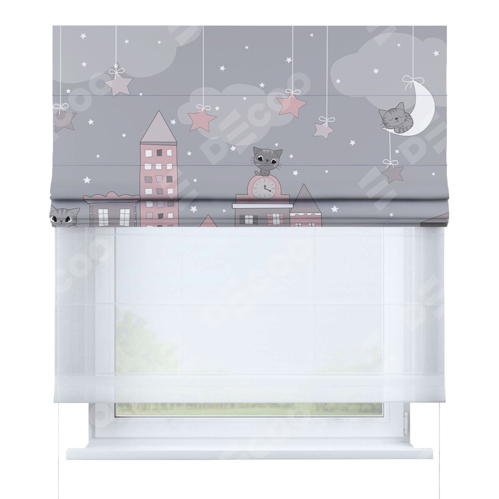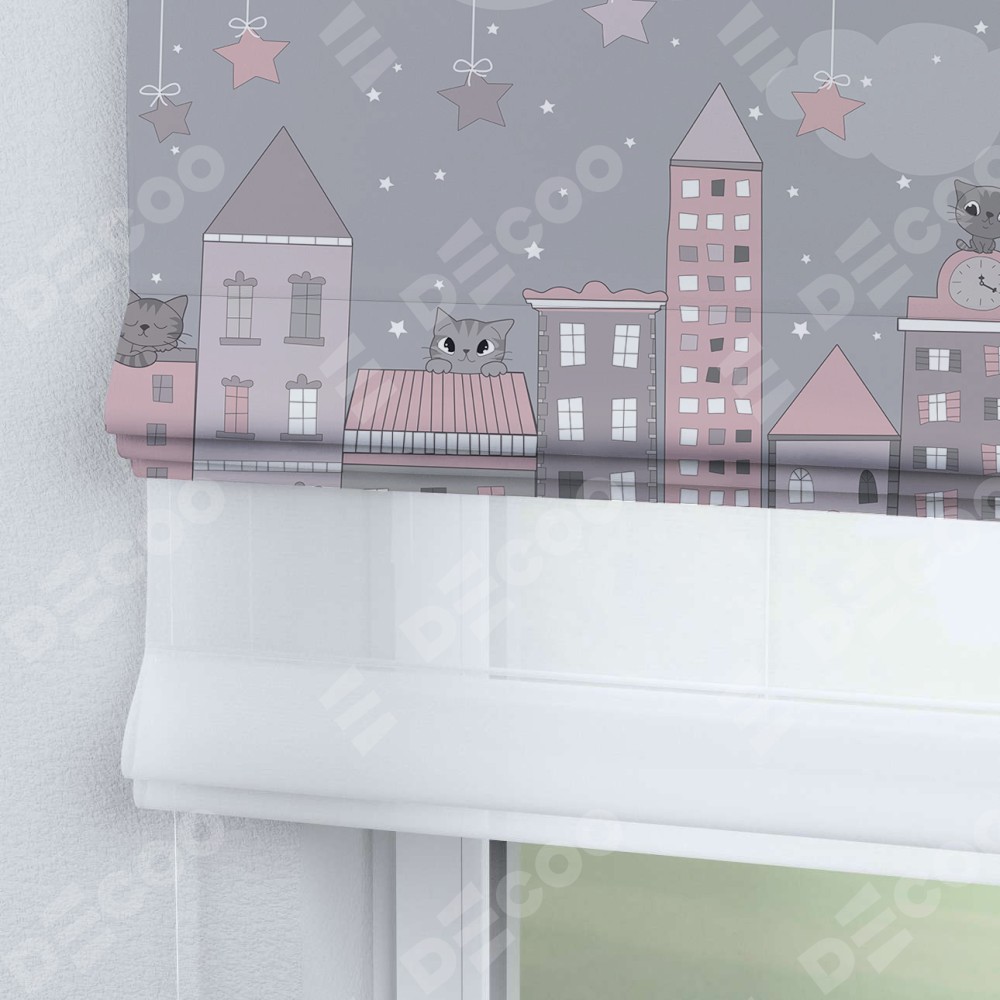 Римская штора день-ночь производителя «Cortin», используется для проёма, пошита из двух полотен, с лицевой блэкаут с нанесением сублимационной печати «Вечерний город», вторая ткань тюль (по стандарту комплектуется тюль белого цвета артикул V-01). Имеет универсальный механизм и подходит для монтажа: на потолок, на стену и в нишу.