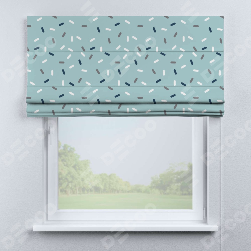Римская штора производителя «Cortin», используется для проёма, пошита из ткани блэкаут с нанесением сублимационной печати «Короткие линии». Имеет универсальный механизм и подходит для монтажа: на потолок, на стену и в нишу.