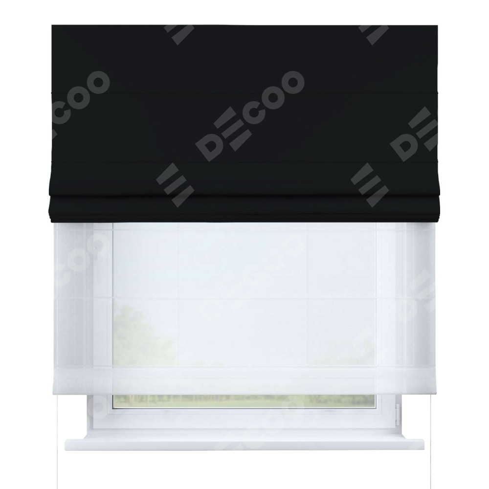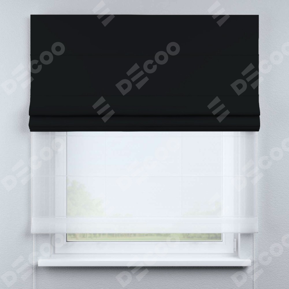 Двойная римская штора «День-ночь» от производителя Cortin предназначена для использования в проёмах. Эта штора уникальна тем, что состоит из двух полотен. На лицевой стороне находится однотонный черный блэкаут (артикул: 91571−2), обеспечивающий эффективное затемнение. В комплект также входит вторая ткань — легкий белый тюль (артикул: V-01), который добавляет изящества и легкости оформлению окна. Кроме того, доступны и другие разновидности ткани тюль, выбор которых доступен по ссылке .