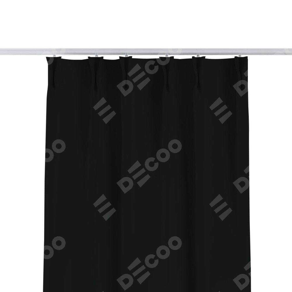 Комплект прямых штор, от производителя «Cortin», пошиты из ткани блэкаут однотонный черный, артикул ткани 91571−2. С изнаночной стороны в верхней части штор пристрачивается шторная лента с декоративными складками «Кустик». Для создания элегантных складок прямые шторы шьются по стандарту с коэффициентом 1:2 (на 100 см. ширины проёма 200 см. ширины ткани).