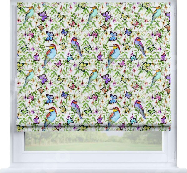 Римская штора производителя «Cortin», устанавливается на створку окна, пошита из ткани блэкаут с нанесением сублимационной печати «Тропические птицы». Штора шьётся по индивидуальным размерам, для данного типа римской шторы возможная ширина от 35 до 150 см., высота до 250 см.