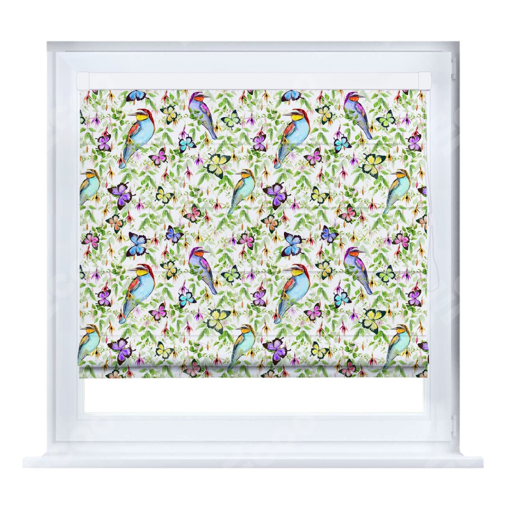 Римская штора кассетного типа, производителя «Cortin», устанавливается только на пластиковые окна и прилегает к стеклопакету, пошита из ткани блэкаут с нанесением сублимационной печати «Тропические птицы».